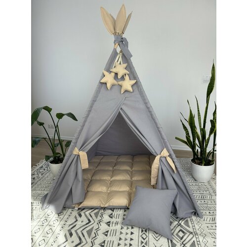 Детский игровой вигвам (домик для детей) - оригинальный подарок для ребёнка, место, где ребенок будет играть и отдыхать. Вигвам просто собрать. Комплект состоит: вигвам (100 % хлопок) с окном и занавеской, флажки-перья на верх вигвама, прочный деревянный каркас из 4-х палок (шлифованная береза, палки сборные 8 штук по 90 см, преобразуются в 4 по 180 см.), веревка, система антискладывания, подушка, коврик фиксируется по углам к опорам, декор в виде трех звездочек. Уход: деликатная машинная стирка, 20 С, 800 оборотов отжим. Конструкция вигвама очень прочная, благодаря специальной системе антискладывания, что позволяет не складываться вигваму даже во время активных игр. Вигвам преображает интерьер, он подойдет в любую детскую и сделает её уютной и яркой. В вигваме интересно играть деткам самых разных возрастов, да и не только деткам, но и взрослым. VIGVAMIK производит вигвамы уже более 7 лет, гарантируем качество и надежность. Будем рады фото-отзывам).