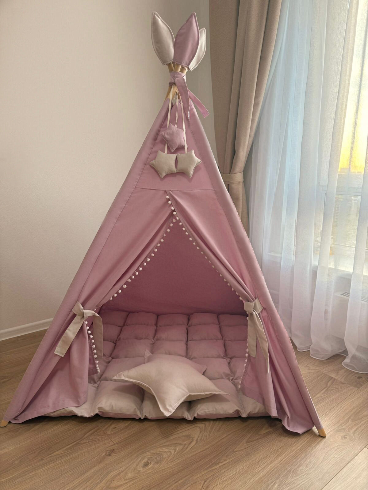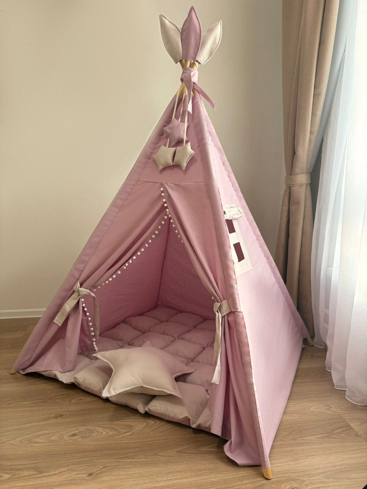 Детский игровой вигвам (домик для детей) - оригинальный подарок для ребёнка, место, где ребенок будет играть и отдыхать. Вигвам просто собрать. Комплект состоит: вигвам (100 % хлопок) с окном и занавеской, флажки-перья на верх вигвама, прочный деревянный каркас из 4-х палок (шлифованная береза, палки сборные 8 штук по 90 см, преобразуются в 4 по 180 см.), веревка, система антискладывания, подушка, коврик фиксируется по углам к опорам, декор в виде трех звездочек. Уход: деликатная машинная стирка, 20 С, 800 оборотов отжим. Конструкция вигвама очень прочная, благодаря специальной системе антискладывания, что позволяет не складываться вигваму даже во время активных игр. Вигвам преображает интерьер, он подойдет в любую детскую и сделает её уютной и яркой. В вигваме интересно играть деткам самых разных возрастов, да и не только деткам, но и взрослым. VIGVAMIK производит вигвамы уже более 7 лет, гарантируем качество и надежность. Будем рады фото-отзывам).