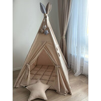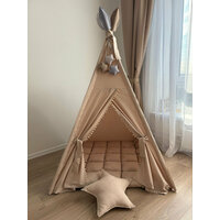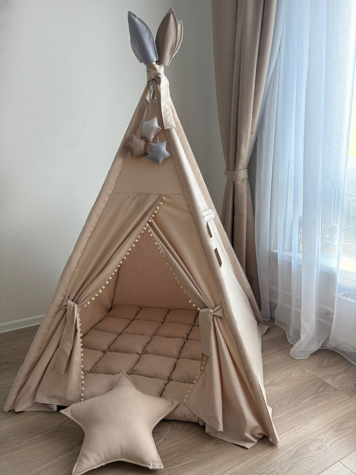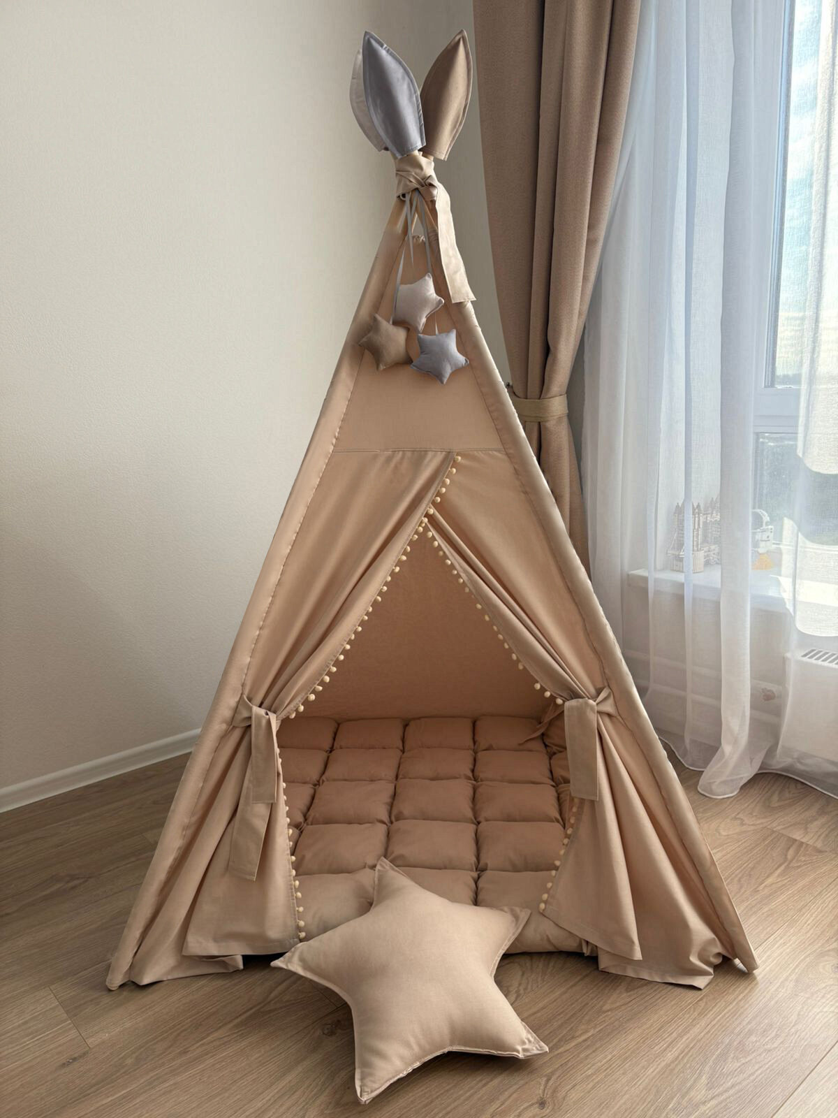 Детский игровой вигвам (домик для детей) - оригинальный подарок для ребёнка, место, где ребенок будет играть и отдыхать. Вигвам просто собрать. Комплект состоит: вигвам (100 % хлопок) с окном и занавеской, флажки-перья на верх вигвама, прочный деревянный каркас из 4-х палок (шлифованная береза, палки сборные 8 штук по 90 см, преобразуются в 4 по 180 см.), веревка, система антискладывания, подушка, коврик фиксируется по углам к опорам, декор в виде трех звездочек. Уход: деликатная машинная стирка, 20 С, 800 оборотов отжим. Конструкция вигвама очень прочная, благодаря специальной системе антискладывания, что позволяет не складываться вигваму даже во время активных игр. Вигвам преображает интерьер, он подойдет в любую детскую и сделает её уютной и яркой. В вигваме интересно играть деткам самых разных возрастов, да и не только деткам, но и взрослым. VIGVAMIK производит вигвамы уже более 7 лет, гарантируем качество и надежность. Будем рады фото-отзывам).