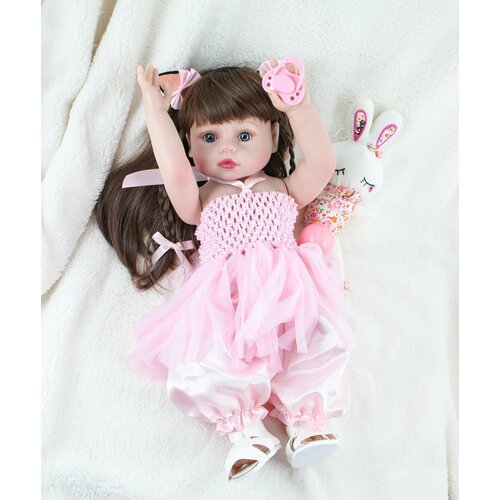 Полностью виниловая кукла-реборн. У игрушки виниловые руки, ноги, голова, тело. Кукла создана из экологически чистых и безопасных материалов. Может сидеть и лежать. Все части тела подвижны.