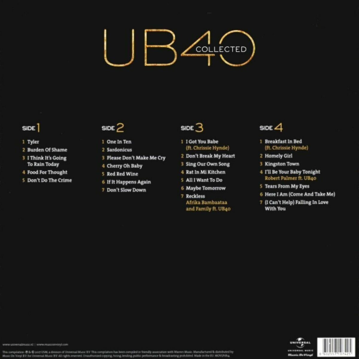 | Треклист | A1. Tyler A2. Burden Of Shame A3. I Think It's Going To Rain Today A4. Food For Thought A5. Don't Do The Crime B1. One In Ten B2. Sardonicus B3. Please Don't Make Me Cry B4. Cherry Oh Baby B5. Red Red Wine B6. If It Happens Again B7. Don't Slow Down C1. I Got You Babe C2. Don't Break My Heart C3. Sing Our Own Song C4. Rat In Mi Kitchen C5. All I Want To Do C6. Maybe Tomorrow C7. Reckless D1. Breakfast In Bed D2. Homely Girl D3. Kingston Town D4. I'll be your Baby Tonight D5. Tears From My Eyes D6. Here I Am (Come And Take Me) D7. (I Can't Help) Falling In Love With You |