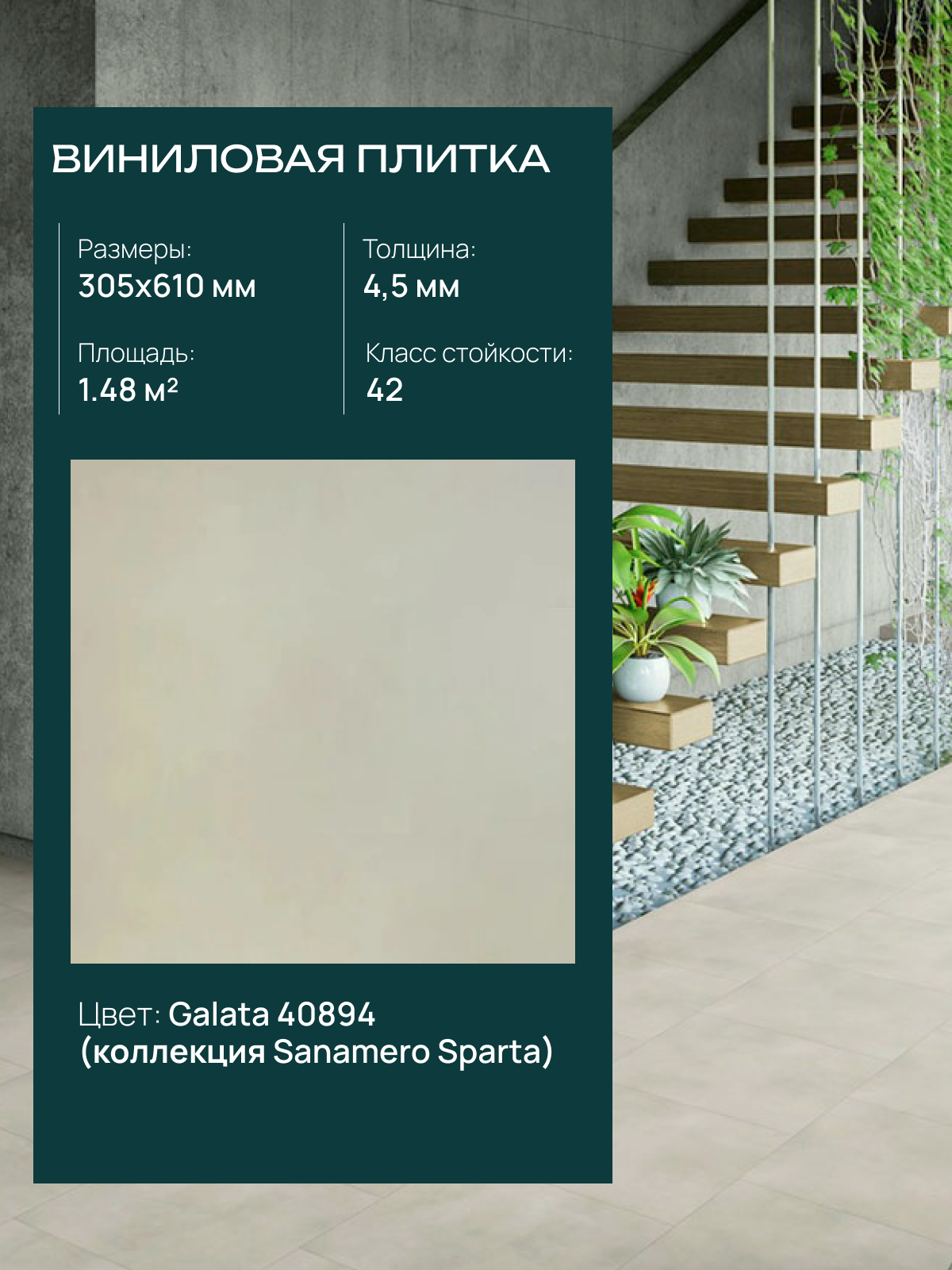Преимущества: Водонепроницаемость Высокая прочность и долговечность Простота монтажа благодаря замковому соединению Имитация натуральной каменной поверхности Виниловая плитка Sanamero серии Sparta создаст стильный и надёжный пол, который сохранит свой первоначальный вид на протяжении долгих лет.