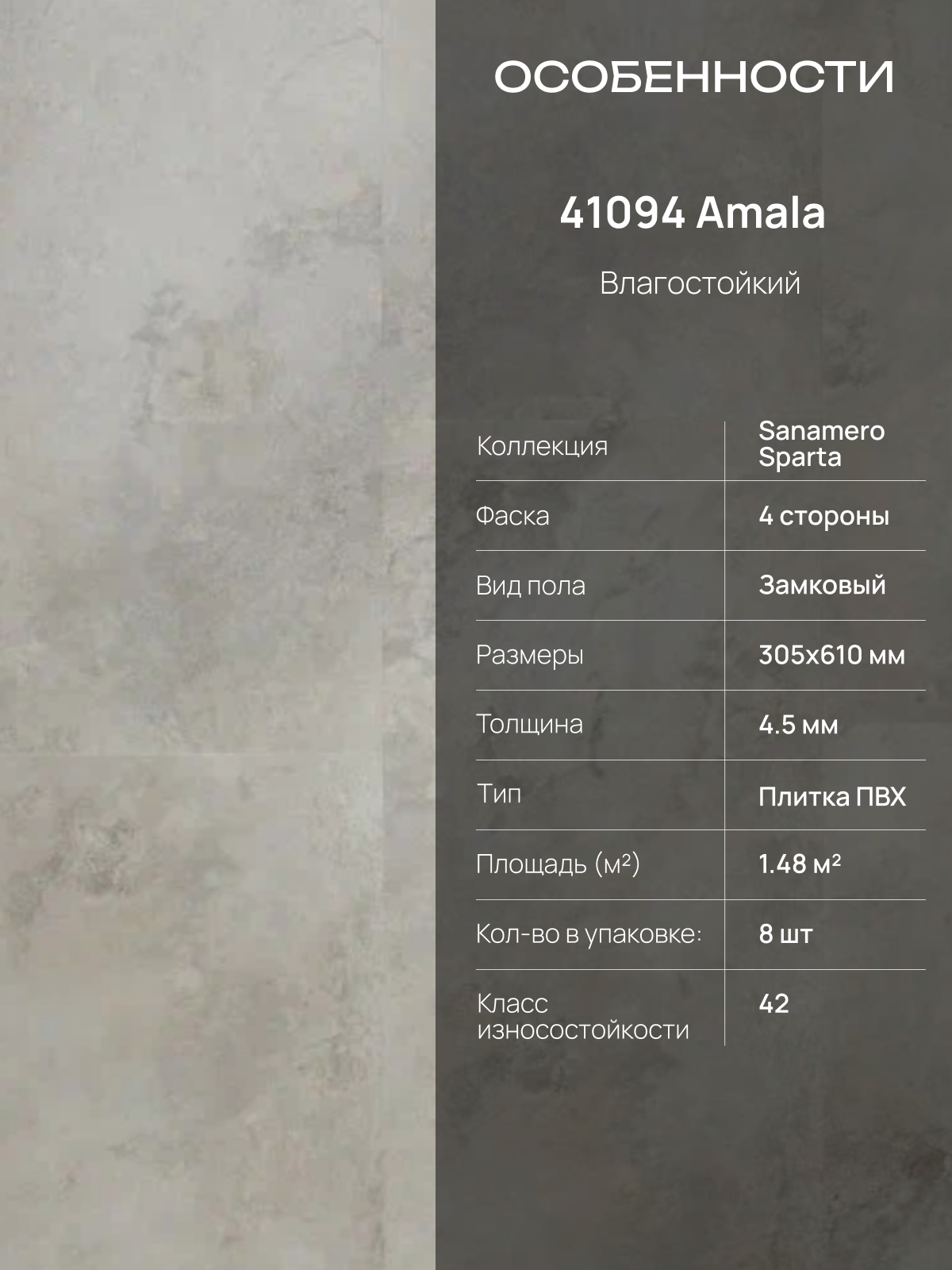 Преимущества: Отличная водонепроницаемость Высокая механическая стойкость Простота установки за счет замкового соединения Имитация натуральной каменной поверхности С плиткой Sanamero серия Sparta вы сможете создать стильный и надежный пол, который сохранит свой первоначальный вид на протяжении многих лет.