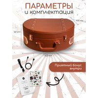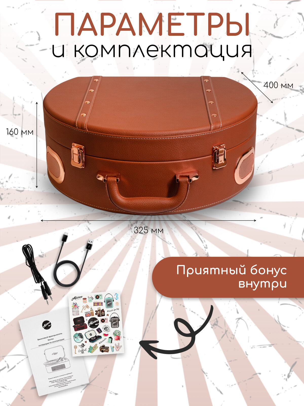 Виниловый проигрыватель Movie - это винтажный дизайн для настоящих любителей стиля ретро-шик! При создании серии виниловых проигрыватель Movie, мы черпали вдохновение из популярных фильмов - Ванильное Небо, Шоколад и Пески Персии. Форма проигрывателя является отсылкой к оскароносному фильму «Форма Воды», в котором использовался проигрыватель круглой формы. Богатый функционал Возможность подключения цифровых устройств по беспроводному каналу Bluetooth. Разъем AUX и RCA-порт, позволяющие слушать любимую музыку через гарнитуру или внешние колонки. Встроенный фазоинвертор, улучшает воспроизведение низких частот (басс) при прослушивании пластинок. Превосходный звук Ременной привод, обеспечивающий равномерное воспроизведение звука; Три скорости воспроизведения (33 1/3, 45, 78 об/мин); Встроенные полнодиапазонные 6-дюймовые динамики; Встроенный Bluetooth для прослушивания музыки со смартфона; Подключение гарнитуры к проигрывателю. Фазоинвертор - улучшает воспроизведение низких частот (басс) Стерео выход RCA (тюльпаны) для подключения к внешней стерео системе Стильный дизайн Виниловый проигрыватель Movie - это отличный подарок для ценителей винтажных вещей, но живущих в ногу со временем. Отделка из кожи в благородных оттенках, застёжки цвета розового золота и удобная ручка под цвет корпуса, придают проигрывателю невероятно стильный вид и позволят ему стать превосходным дополнением практически любого интерьера, в котором хочется подчеркнуть ретро стиль. Продуманный функционал поможет наслаждаться чистым звучанием любимых музыкальных композиций на виниловых пластинках без границ!
