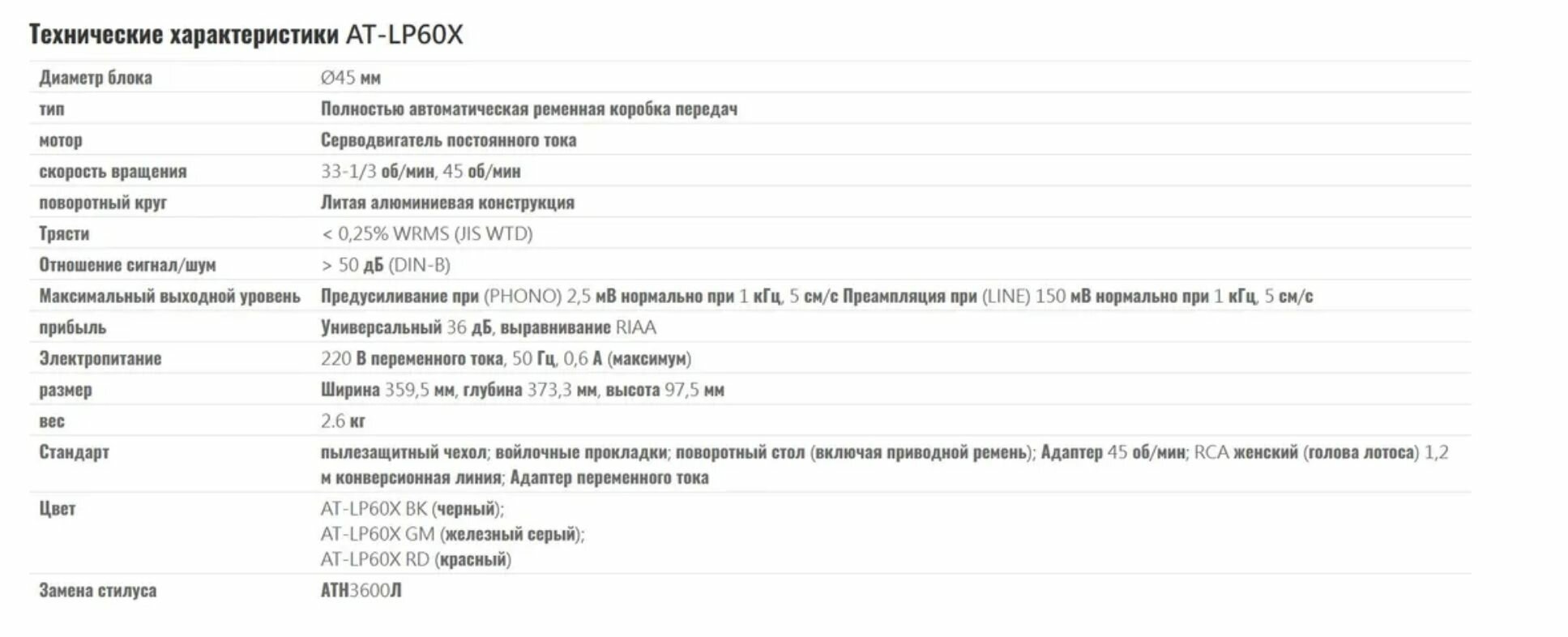 | Комплектация | виниловый проигрыватель AT-LP60X,съемный кабель 3.5 мм (штекер) - 2* RCA (штекер), адаптер для пластинок на 45 оборотов в минуту, съемная пылезащитная крышка, инструкция пользователя, гарантийный талон |