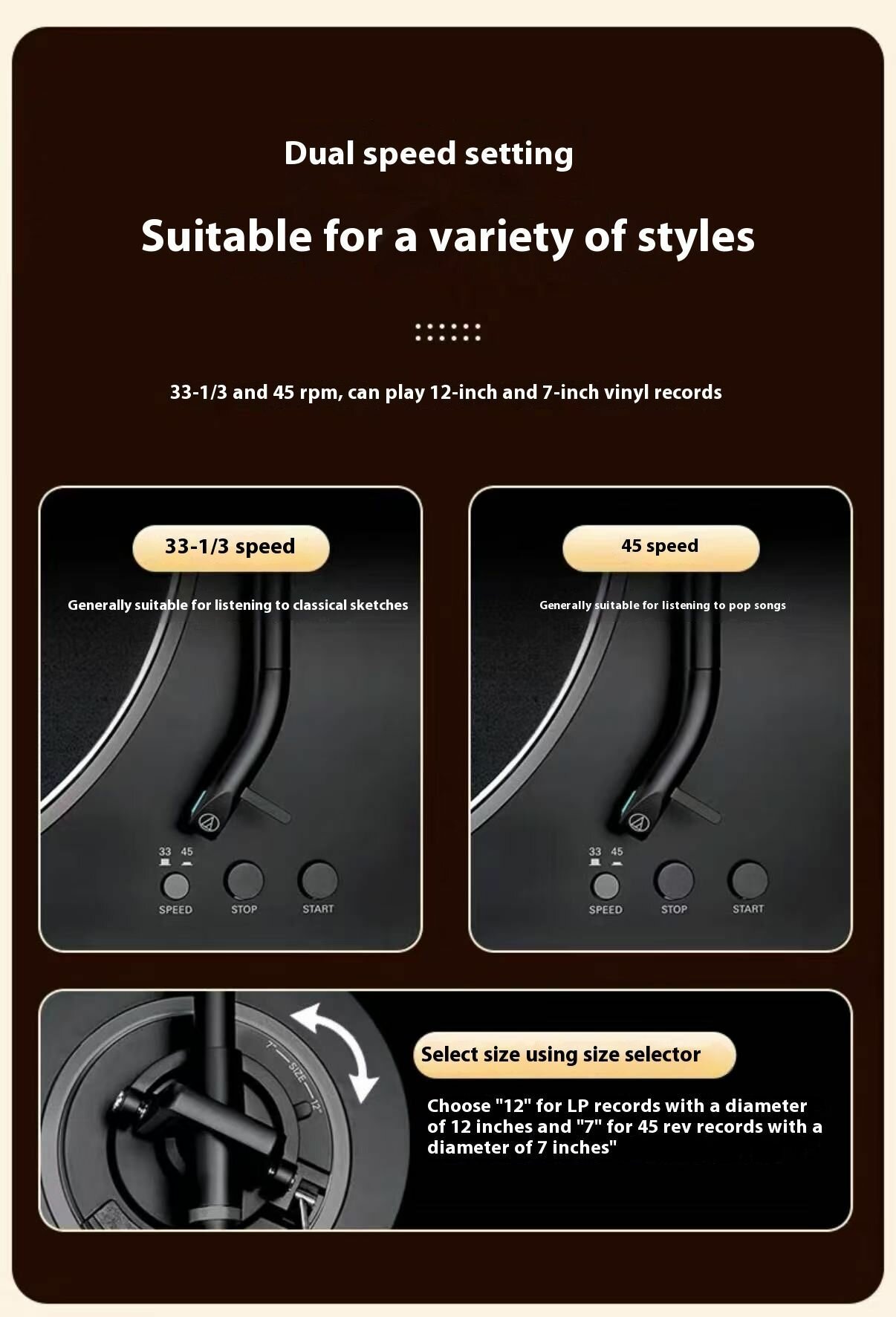 виниловый проигрыватель LP-200B, адаптер для пластинок на 45 оборотов в минуту, инструкция пользователя, фетровый коврик, RCA-аудиокабель 1,2 м., гарантийный талон