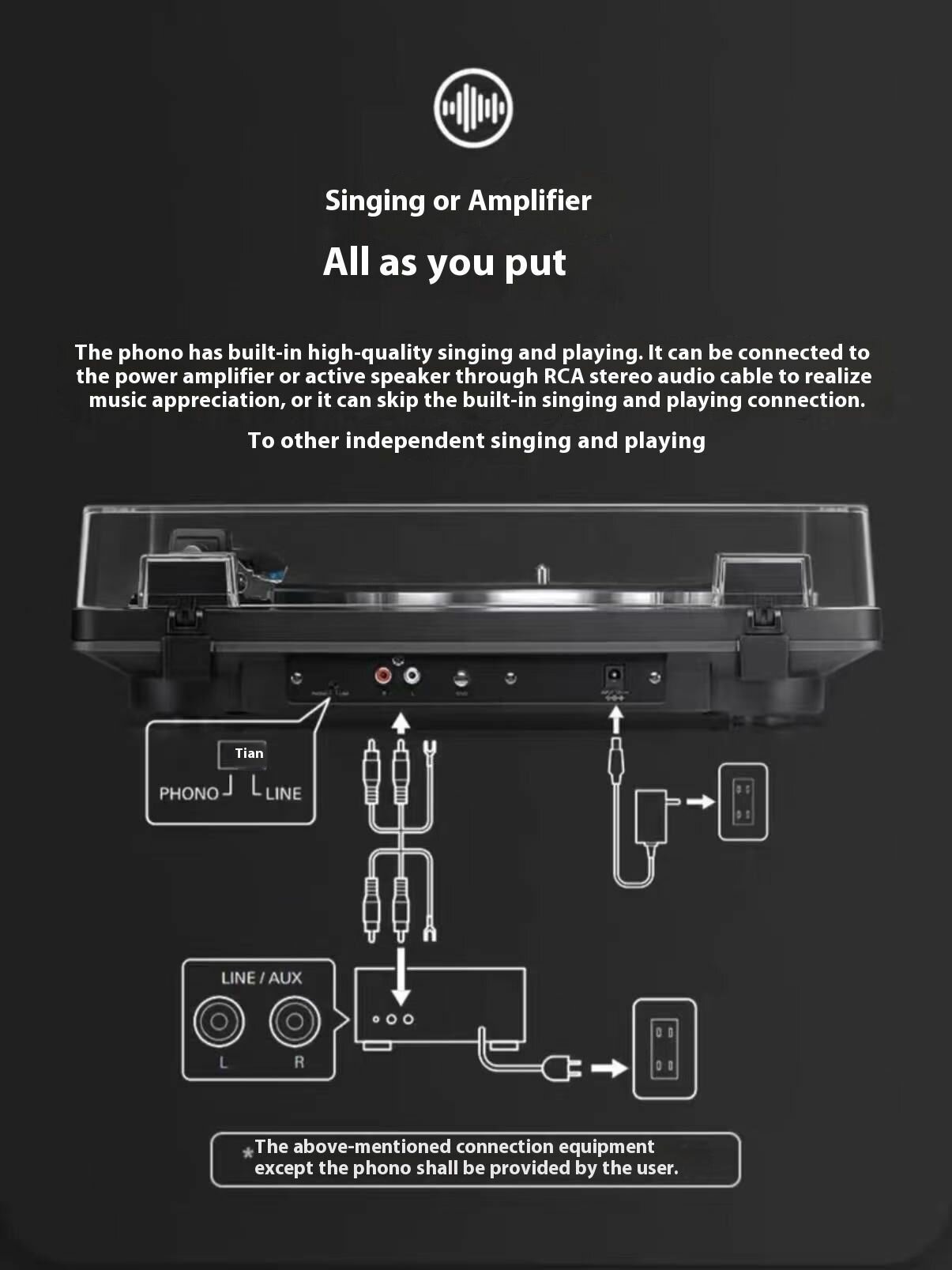 Bluetooth (v5.0, A2DP, радиус действия 10 м); поддержка кодеков SBC, Qualcomm aptX; уровень выходного сигнала: фонокорректор - 2,5 мВ на частоте 1 кГц, 5 см/сек; линейный - 150 мВ на частоте 1 кГц, 5 см/сек; комплектация: RCA-аудиокабель 1,2 м.