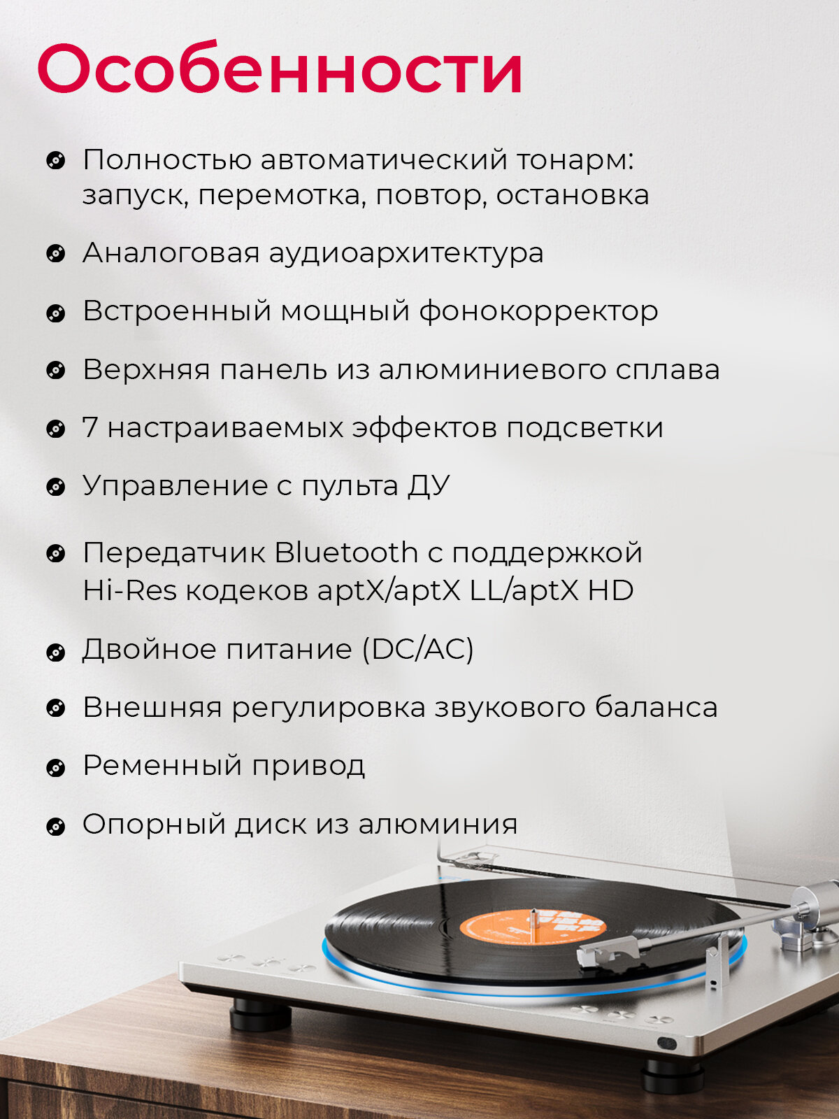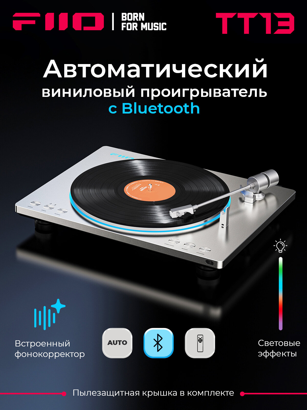 Виниловый проигрыватель FIIO TT13 BT (F3491T) silver, Bluetooth, встроенный фонокорректор, управление с пульта, световые эффекты