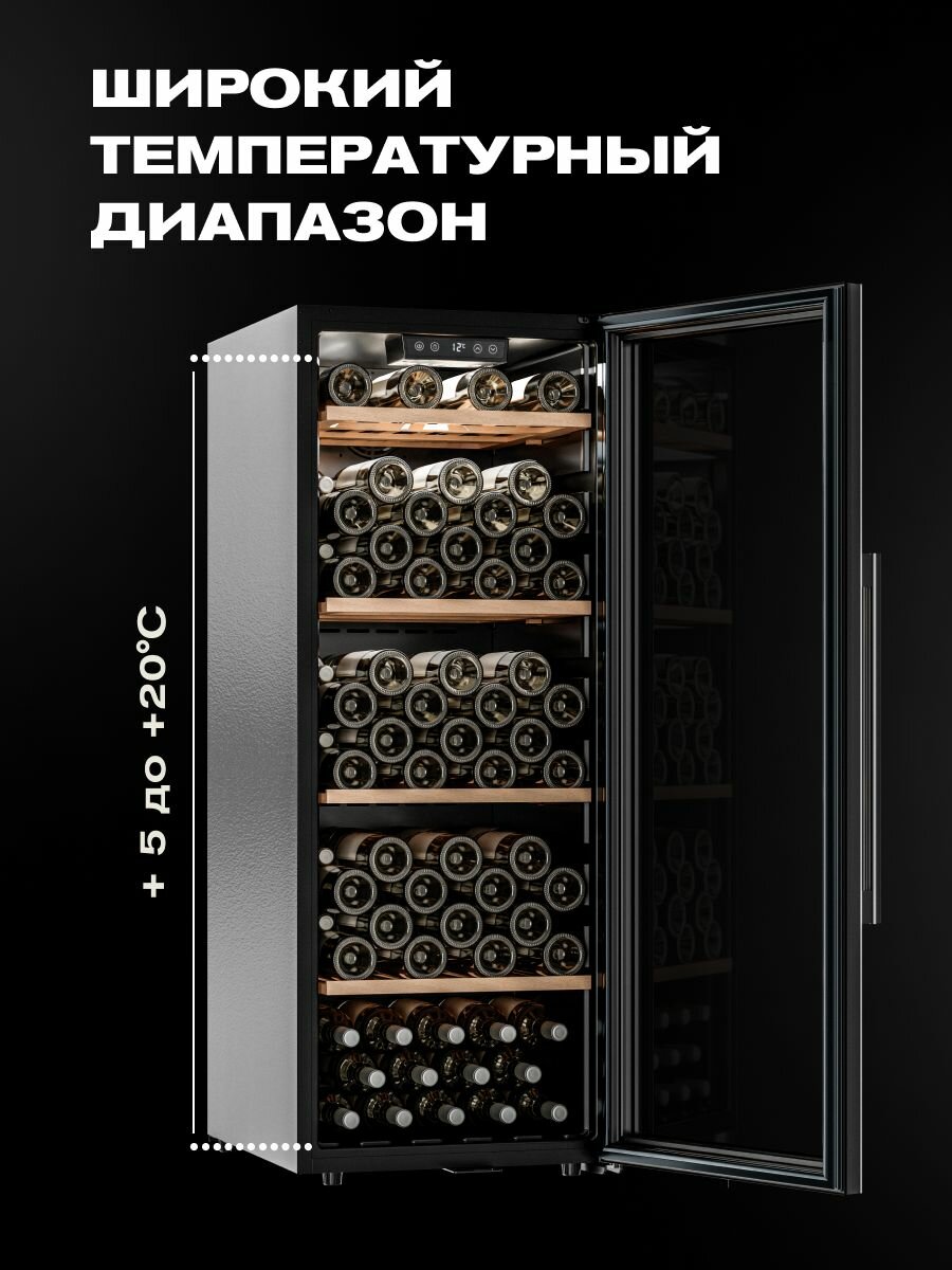 Модель оснащена четырьмя полками из дерева, что не только выглядит стильно, но и способствует правильной циркуляции воздуха внутри шкафа. Двойное стекло с УФ-фильтром надежно защищает вино от вредного воздействия света, что сохраняет его уникальный вкус и аромат.