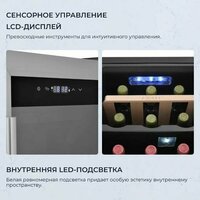 Винный шкаф Zugel ZTWF182DX разработан с использованием безопасного для окружающей среды хладагента. Модель с камерой объемом 46 л соответствует современным стандартам энергоэффективности — А+. За год расходуется до 50 кВт*ч. Тип вилки — евростандарт (С). • Пять деревянных полок Бережное размещение до 18 бутылок по 0,75 л. • Многопоточная система охлаждения Поддержка стабильной температуры и уровня влажности. • Светодиодное освещение Позволяет хорошо видеть содержимое устройства. • Защита от УФ-лучей Дверца произведена из многослойного тонированного стекла с УФ-фильтром, что исключает негативное воздействие на напитки. Поверхность шкафа устойчива к царапинам и легко очищается. • Электронное управление Сенсорная панель с цифровым дисплеем отображает текущие показатели, упрощая процесс настройки и контроль. • Световая и звуковая сигнализация Активируется при неплотном закрывании двери. • Функция блокировки для защиты от детей Исключает случайное изменение параметров. Компрессор выдает уровень шума до 33 дБ. Световые индикации показывают включение и активный режим. В устройстве предусмотрен автоматический предохранитель, предотвращающий перегрузки и короткие замыкания. Регулируемые ножки предназначены для устойчивой установки на любой напольной поверхности.