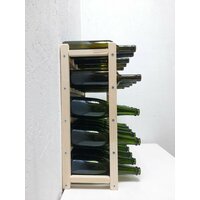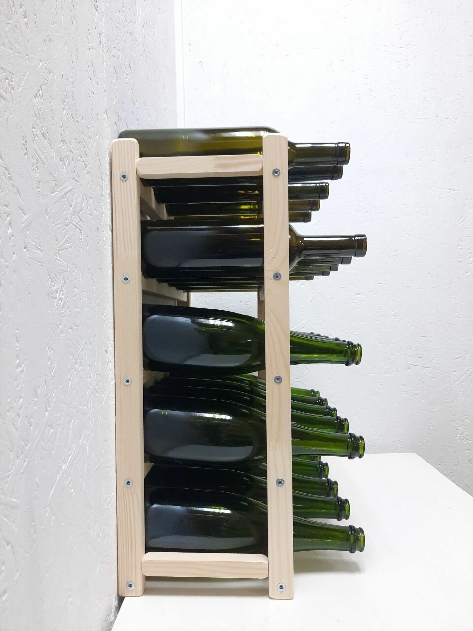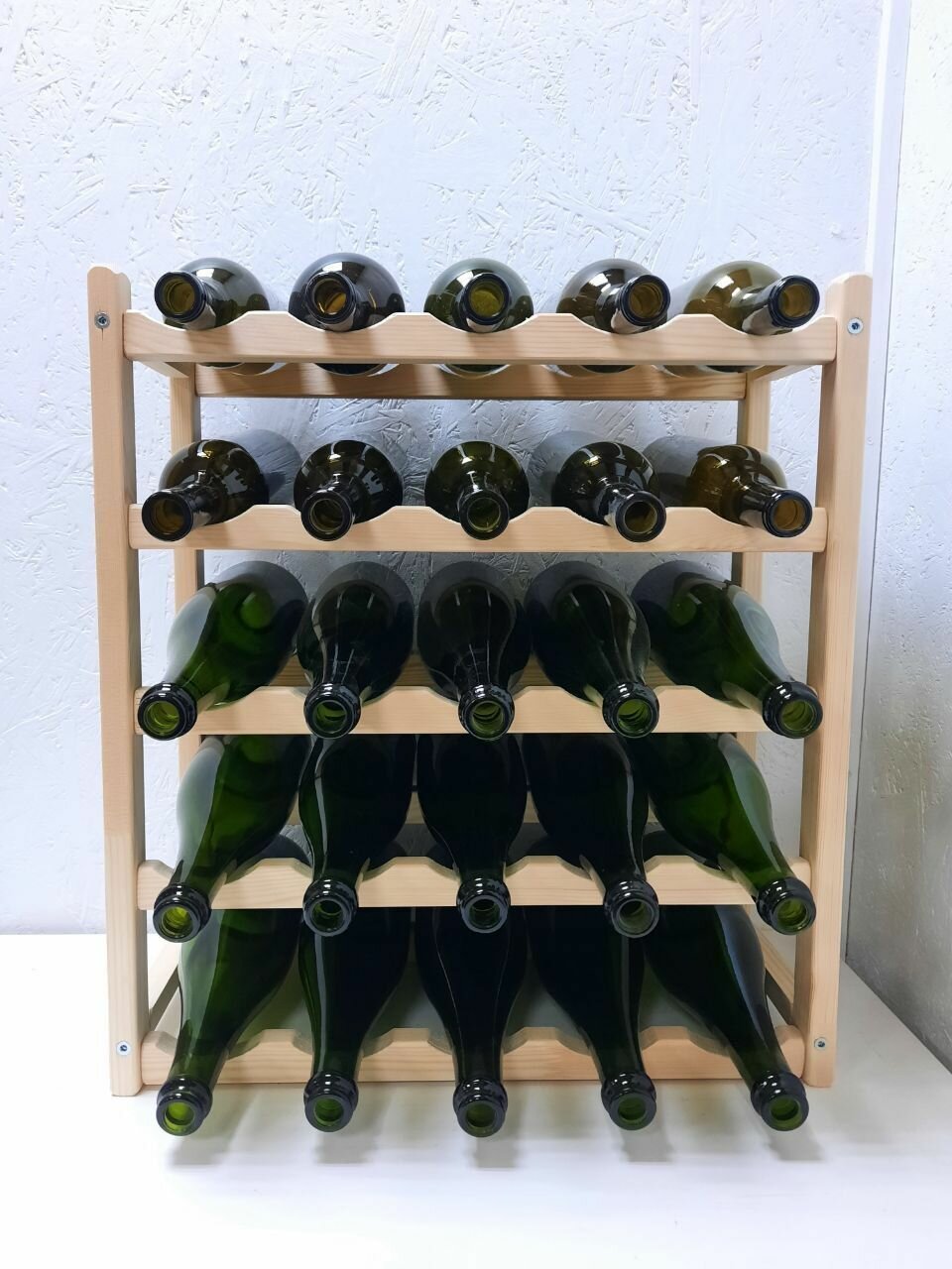 Стеллаж для вина. Шампанское помещается при чередовании с вином. Собственная ячейка для каждой бутылки - надежное хранение вашей коллекции! Сделан из сосны и собран на мебельные конфирматы - залог долговечности и качества. Доставляем в полу-разобранном виде, ключ, конфирматы. Размеры изделия без бутылок: Высота 54 см, глубина 20 см, ширина 49 см. Высота с верхней бутылкой 58-60 см, глубина стеллажа с винной бутылкой 30-32 см, в зависимости от бутылки. Винный стеллаж ничем не покрыт, в натуральном цвете дерева, под покраску. В нашем ассортименте десятки стеллажей для вина, стеллажей для шампанского, винных полок. Разные размеры, цвета, кол-во бутылок. Все товары можете посмотреть перейдя по названию магазина "Мастерская Цвет Дерева"