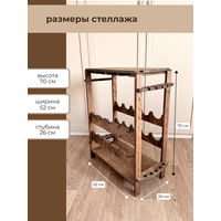 Размеры стеллажа без бутылок составляют 54 см в высоту, 20 см в глубину и 49 см в ширину. С верхней бутылкой высота стеллажа составляет 58-60 см, а глубина с винной бутылкой – 30-32 см, в зависимости от размера бутылки.