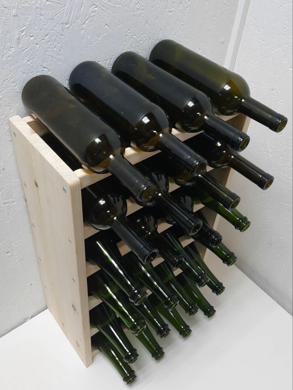 Стеллаж для вина на 24 бутылки. Шампанское помещается при чередовании с вином. Собственная ячейка для каждой бутылки - надежное хранение вашей коллекции! Винный стеллаж можно поставить вплотную к стене.