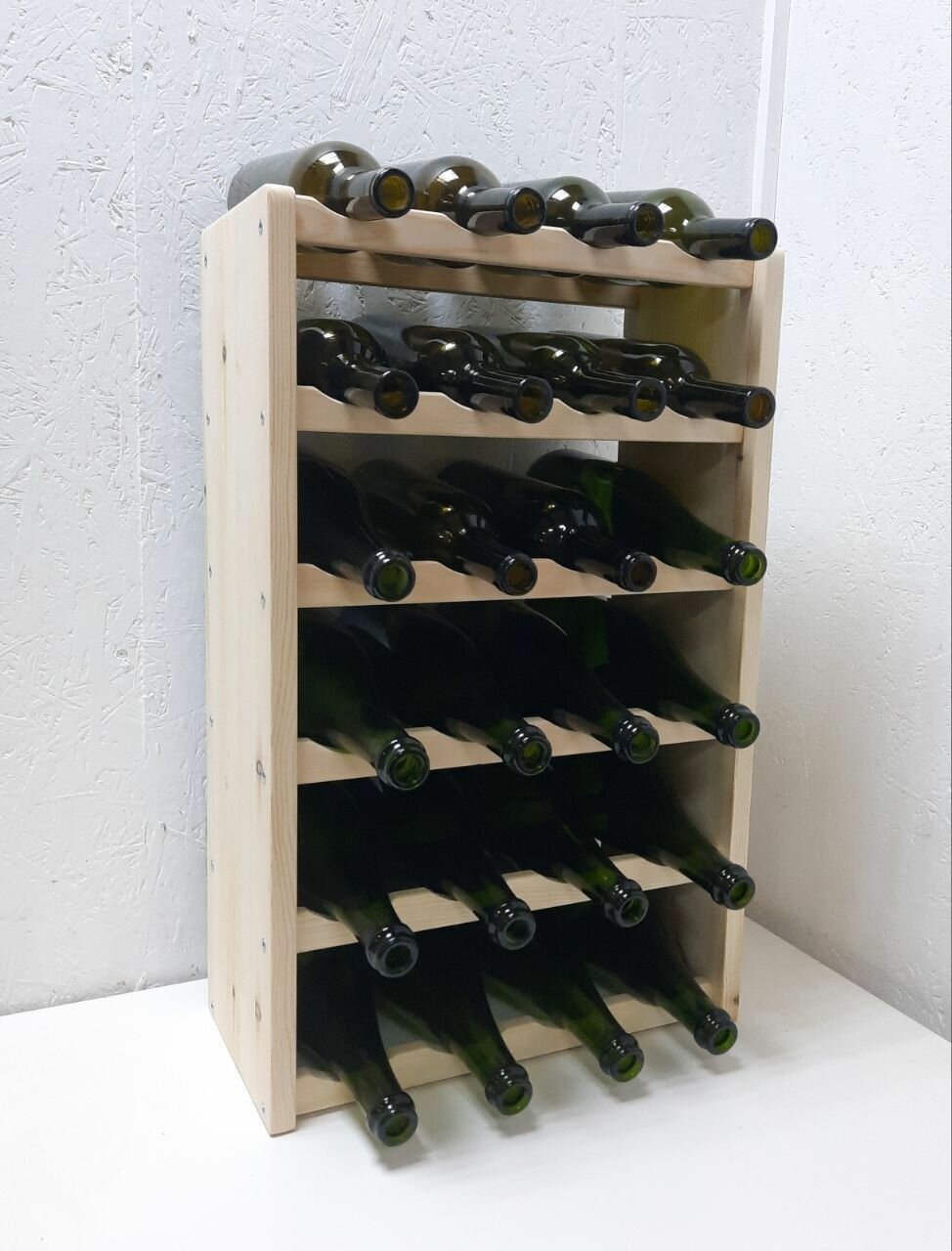 Сделан из сосны и собран на мебельные конфирматы - залог долговечности и качества. За счет цельных деревянных стоек и деревянных держателей с вырезами под бутылки, стеллаж имеет огромный запас прочности. Доставляем в разобранном виде, ключ и конфирматы в комплекте.