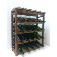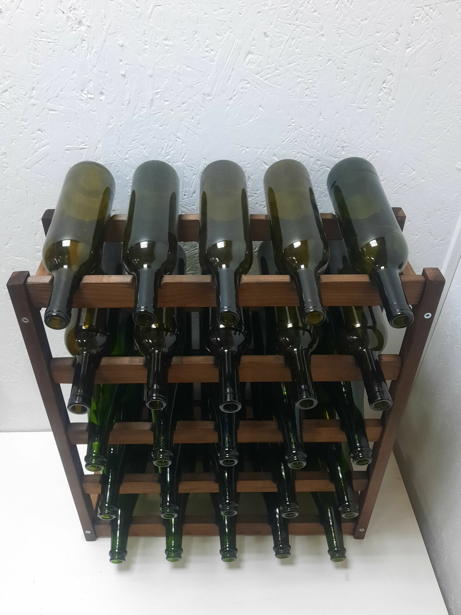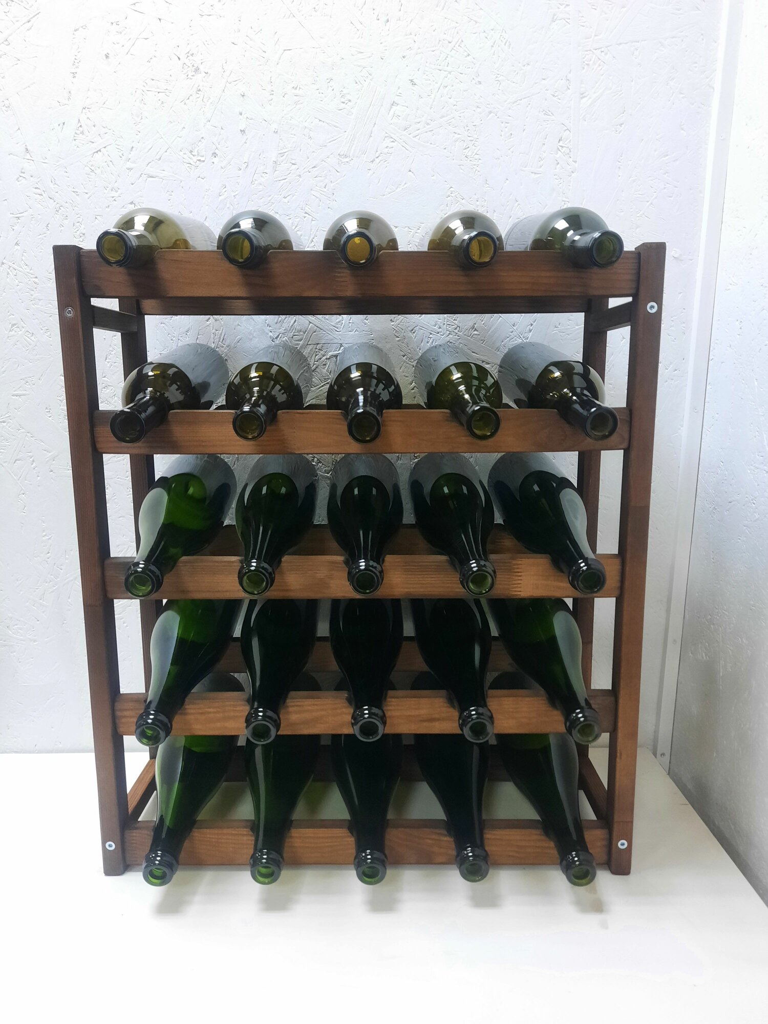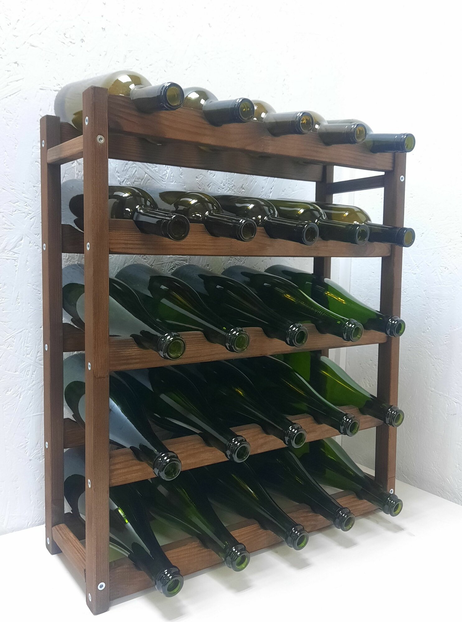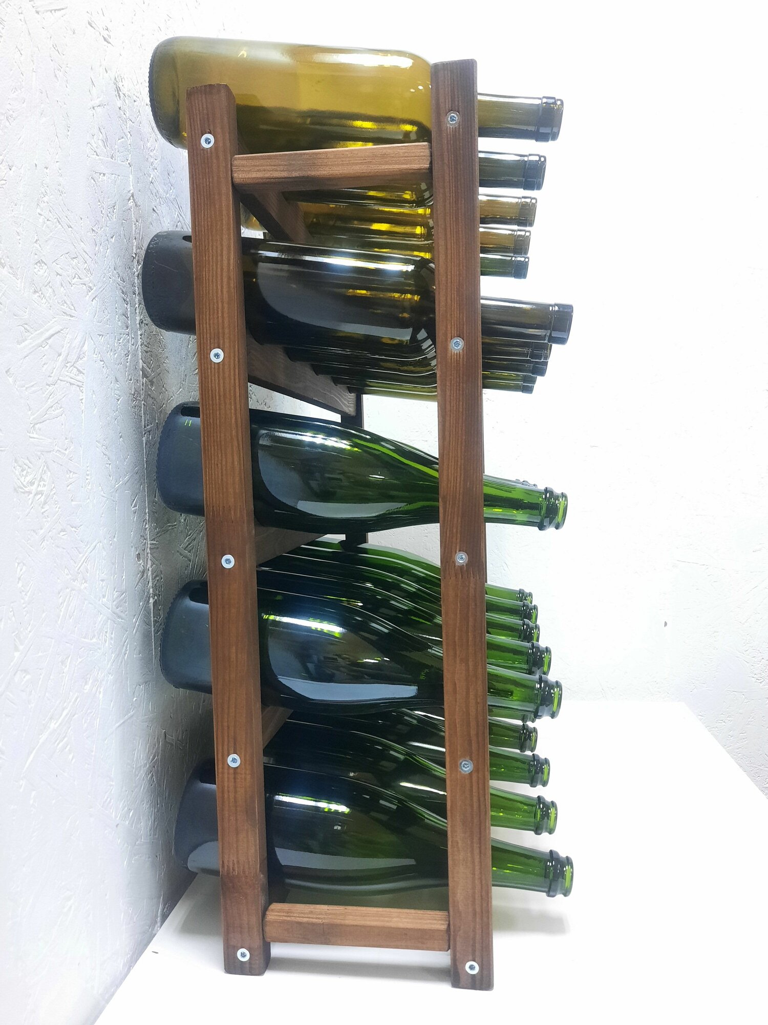 Стеллаж для вина и шампанского. Собственная ячейка для каждой бутылки - надежное хранение вашей коллекции! Сделан из сосны и собран на мебельные конфирматы - залог долговечности и качества. Доставляем в полусобранном виде, ключ в комплекте. Размеры изделия без бутылок: Высота 64 см, глубина 25 см, ширина 54 см. Высота с верхней бутылкой 68-70 см, глубина стеллажа с винной бутылкой 30-32 см, в зависимости от бутылки. Покрыт натуральной морилкой в коричневый цвет.