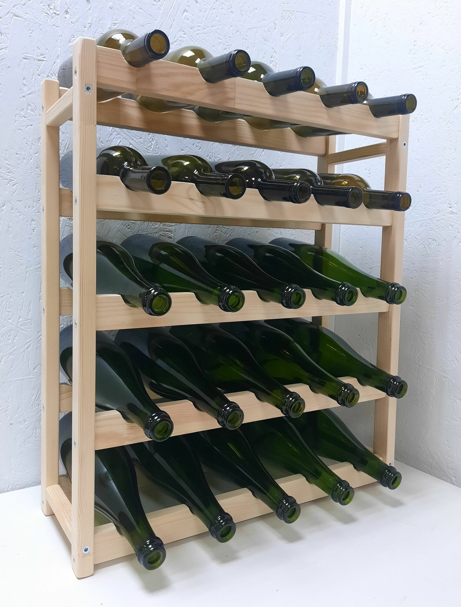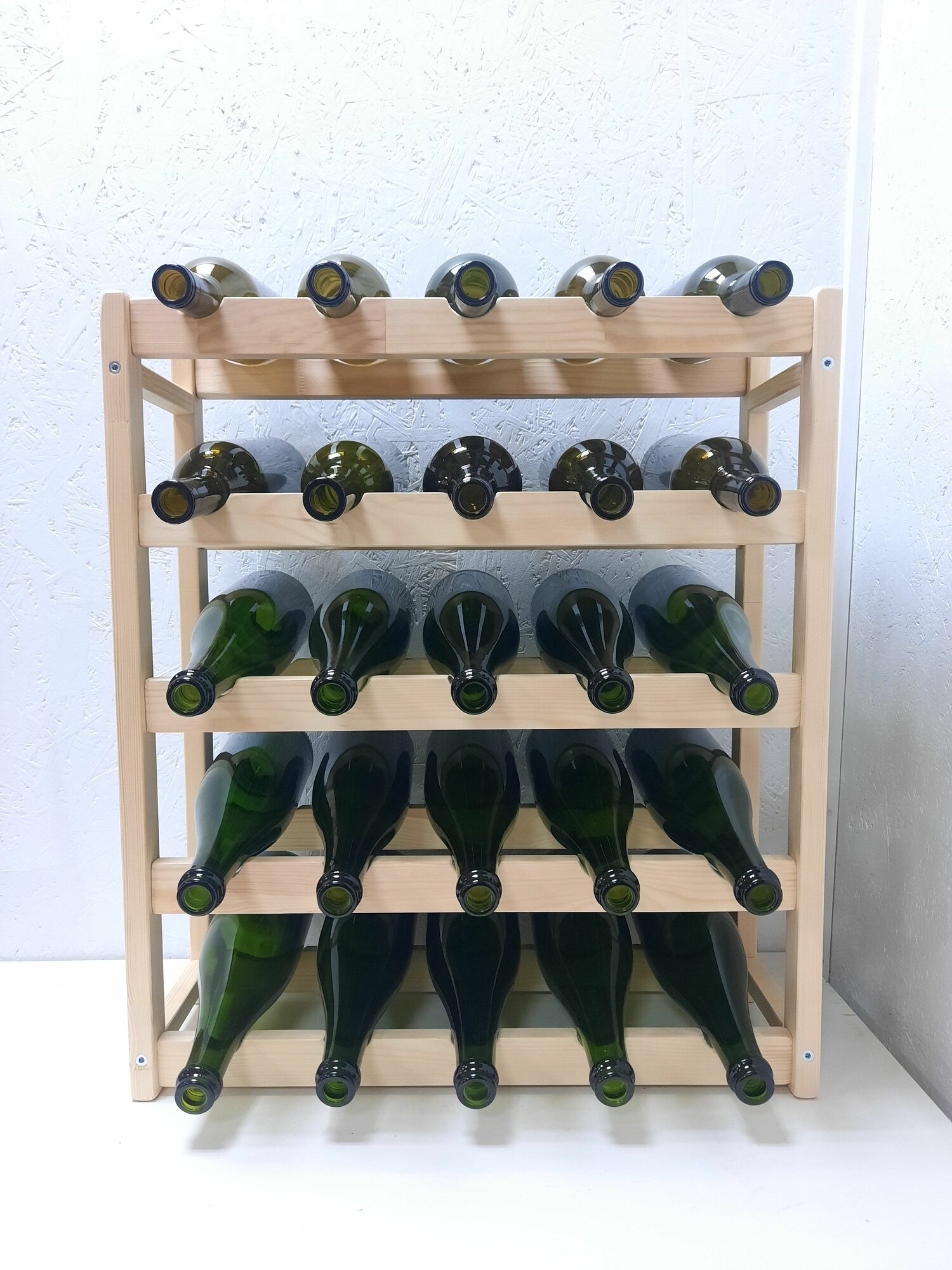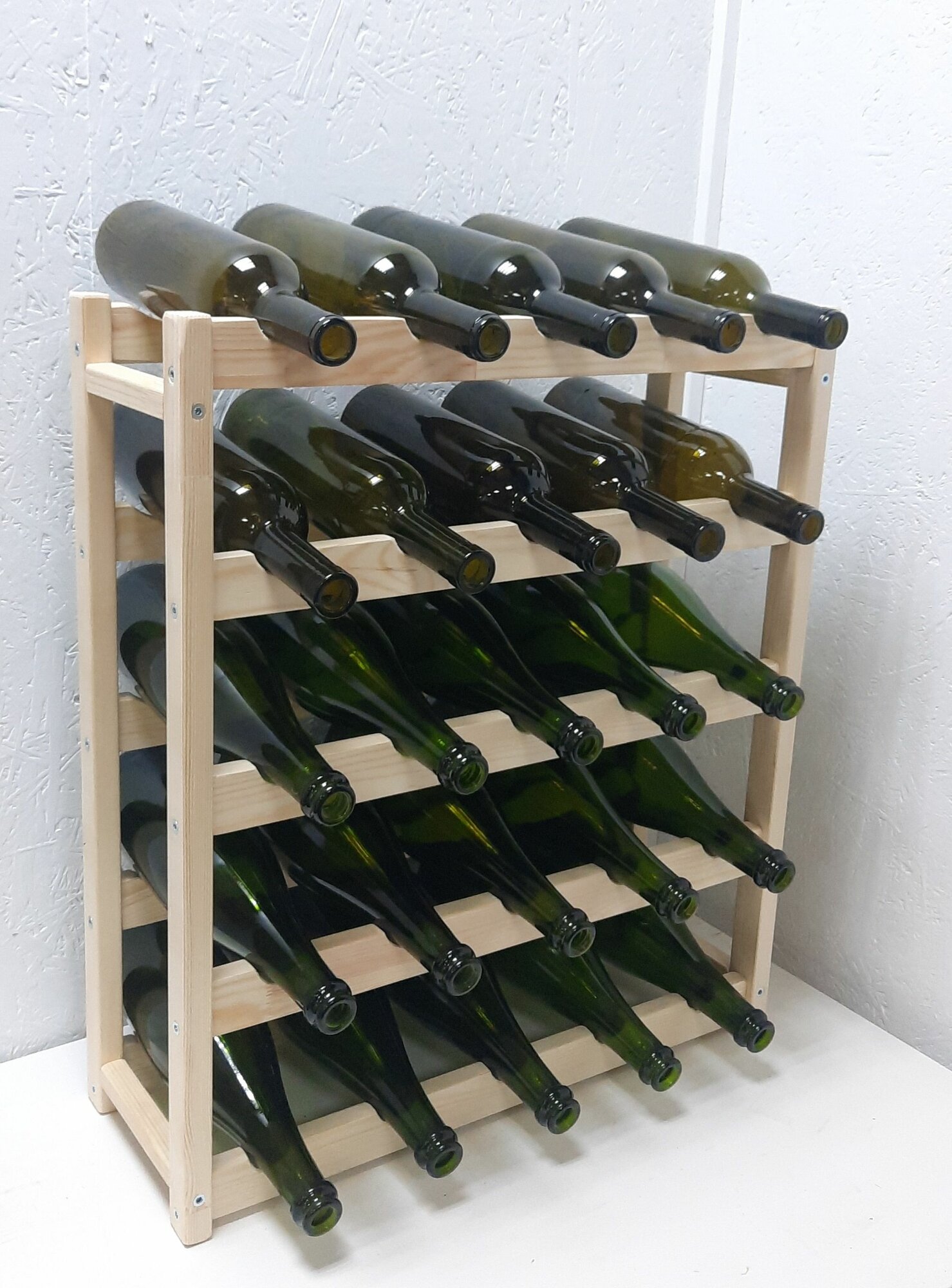 Стеллаж для вина и шампанского. Собственная ячейка для каждой бутылки - надежное хранение вашей коллекции! Сделан из сосны и собран на мебельные конфирматы - залог долговечности и качества. Доставляем в полусобранном виде, ключ в комплекте. Размеры изделия без бутылок: Высота 64 см, глубина 25 см, ширина 54 см. Высота с верхней бутылкой 68-70 см, глубина стеллажа с винной бутылкой 30-32 см, в зависимости от бутылки. Без покрытия - вы можете покрасить в любой цвет либо оставить натуральный цвет дерева.