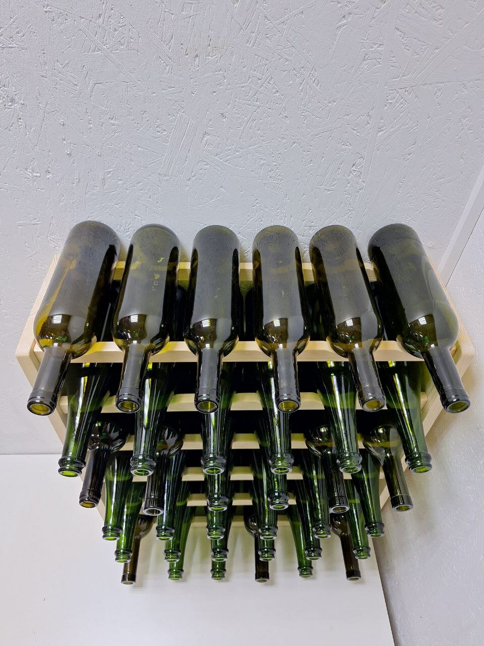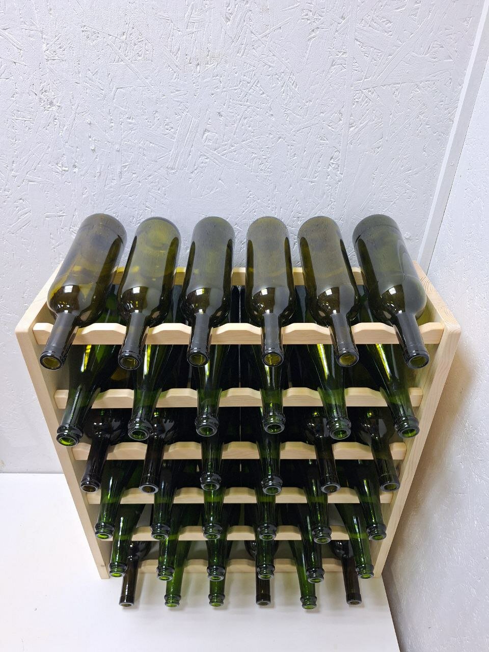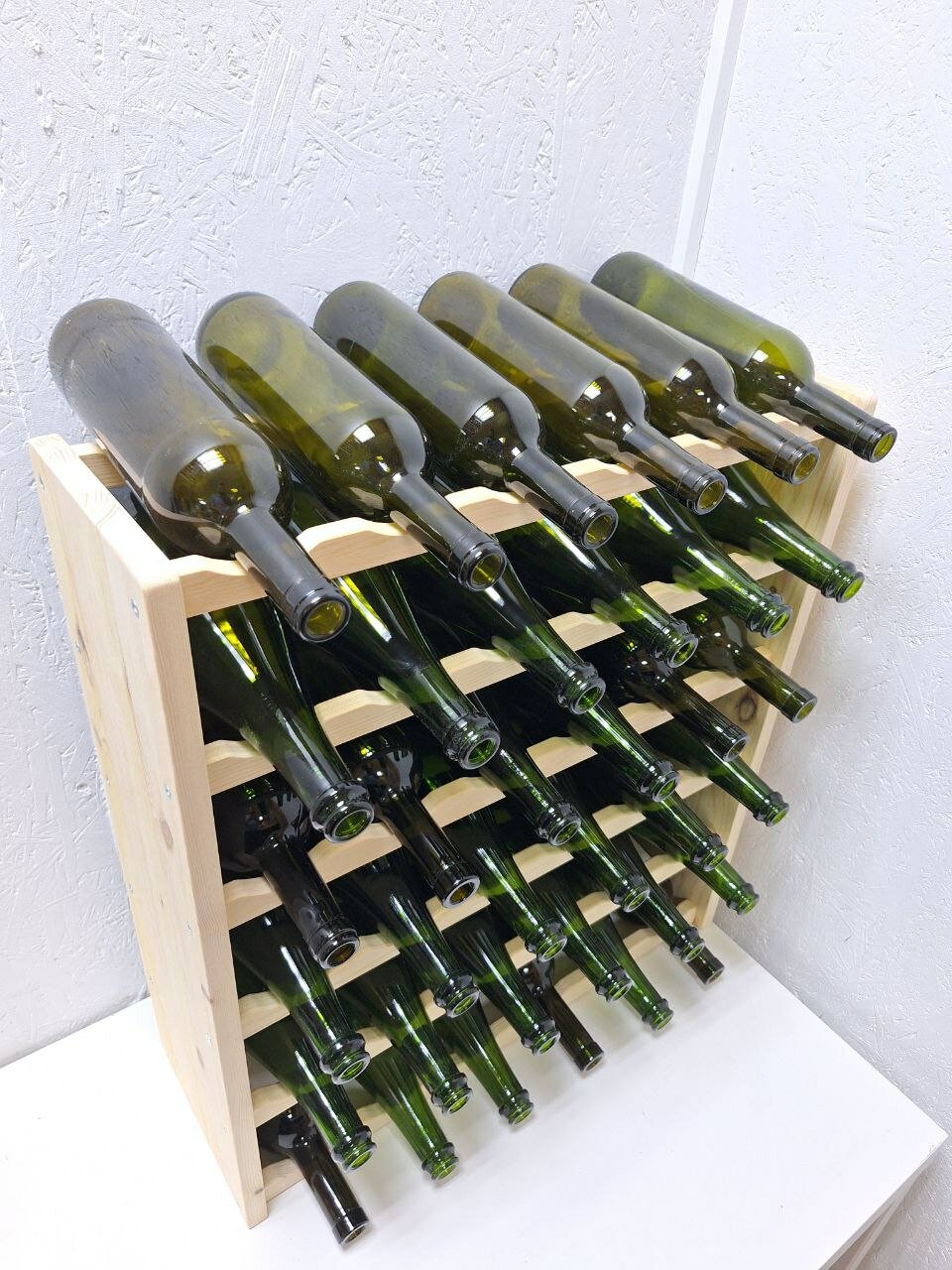 Стеллаж для вина на 36 бутылок. Шампанское помещается при чередовании с вином. Собственная ячейка для каждой бутылки - надежное хранение вашей коллекции! Винный стеллаж можно поставить вплотную к стене. Сделан из сосны и собран на мебельные конфирматы - залог долговечности и качества. За счет цельных деревянных стоек и деревянных держателей с вырезами под бутылки, стеллаж имеет огромный запас прочности. Доставляем в разобранном виде, ключ и конфирматы в комплекте. Размеры изделия без бутылок: Высота 63 см, глубина 20 см, ширина 58 см. Высота с верхней бутылкой 69-71 см, глубина стеллажа с винной бутылкой 30-32 см, в зависимости от бутылки. Винный стеллаж без покрытия, в натуральном цвете дерева, под покраску. В нашем ассортименте десятки стеллажей для вина, стеллажей для шампанского, винных полок. Разные размеры, цвета, кол-во бутылок. Все товары можете посмотреть перейдя по названию магазина "Мастерская Цвет Дерева"
