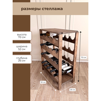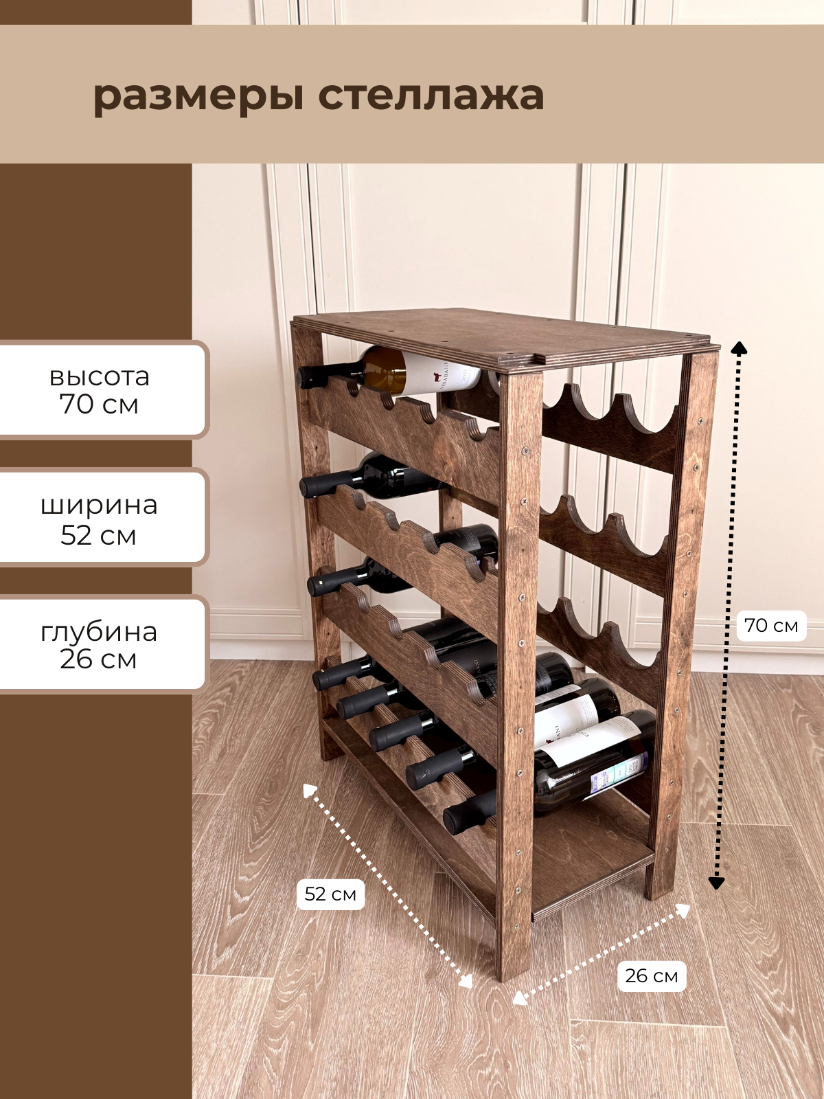 Размеры стеллажа без бутылок составляют 54 см в высоту, 20 см в глубину и 49 см в ширину. С верхней бутылкой высота стеллажа составляет 58-60 см, а глубина с винной бутылкой – 30-32 см, в зависимости от размера бутылки.