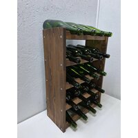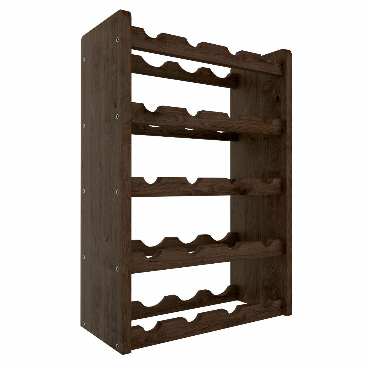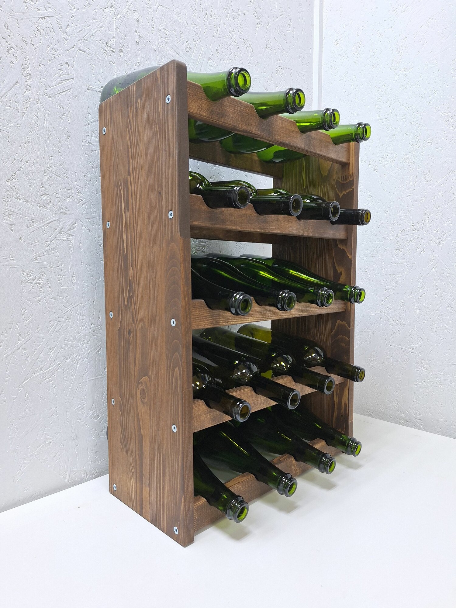 Стеллаж для вина и шампанского. Собственная ячейка для каждой бутылки - надежное хранение вашей коллекции! Сделан из сосны и собран на мебельные конфирматы - залог долговечности и качества. За счет цельных стоек стеллаж имеет огромный запас прочности. Доставляем в разобранном виде, ключ и конфирматы в комплекте. Размеры изделия без бутылок: Высота 62 см, глубина 20 см, ширина 43.5 см. Высота с верхней бутылкой 68-70 см, глубина полки с винной бутылкой 30-32 см, в зависимости от бутылки. Винный стеллаж затонирован в коричневый цвет.