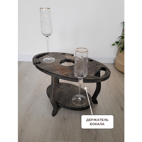 Особенностью винного столика является наличие отверстий под бокалы и фиксатора, что позволяет удобно разместить и сохранить бокалы во время использования.