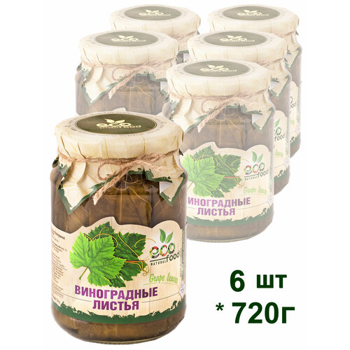 Продукт представлен в удобной стеклянной банке, что обеспечивает его сохранность и свежесть. В каждой банке содержится 6 целых виноградных листьев общим весом 720 грамм.