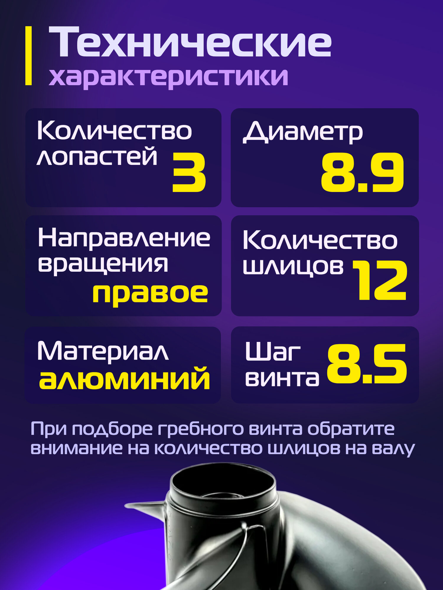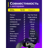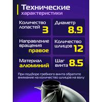 Технические характеристики: Диаметр: 8.9" Шаг: 8.5" Лопастей: 3 Материал: алюминий Направление вращения: правое Количество шлицов: 12 Подходит для моторов: Tohatsu 8-9.8 л. с. и его аналогов: KITAMI, MARLIN, HANGKAI, GLADIATOR, HDX, Parsun, SEA PRO, TOYAMA и других.