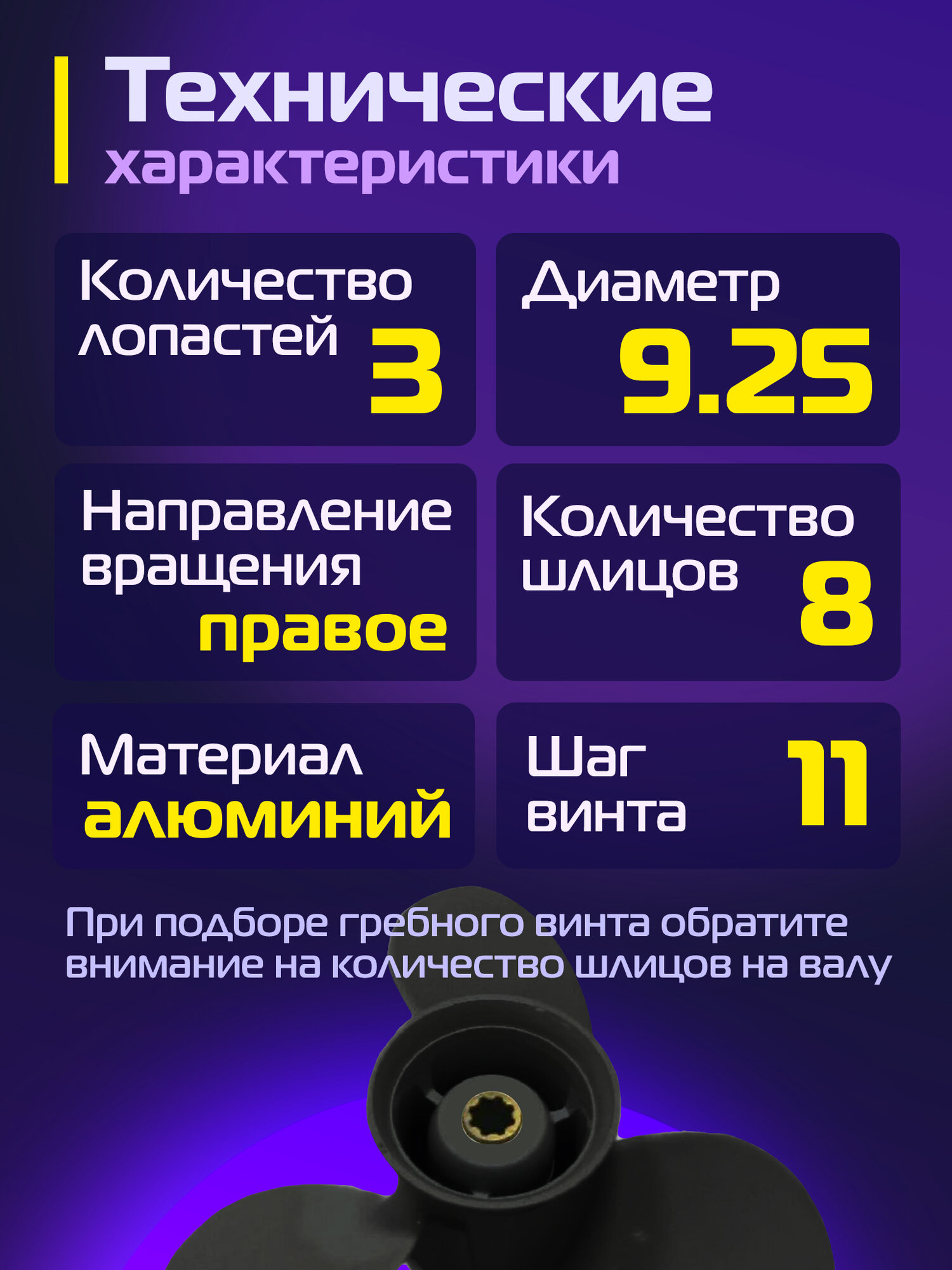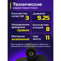 Ключевые характеристики: Диаметр: 9 1/4" Шаг: 11" Количество лопастей: 3 Материал: алюминиевый сплав Направление вращения: правое Количество шлицов на валу: 8 Подходит для замены штатных винтов и улучшения производительности лодочного мотора.
