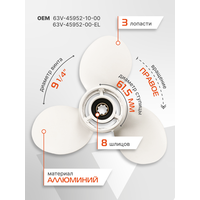Алюминиевый трехлопастной гребной винт с резиновой втулкой амортизатором для подвесных лодочных моторов Yamaha мощностью 9.9-20 л. с.