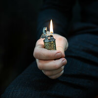 Классическая бензиновая зажигалка компактной, овальной формы. Рисунок на зажигалке перекликается с латунным портсигаром из коллекции нашего магазина.
