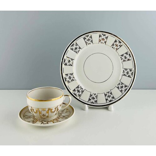 На винтажном товаре могут присутствовать следы бытования, потертости. Пожалуйста, внимательно смотрите фотографии или уточняйте у нашей поддержки интересующие Вас детали. Винтажное кофейное трио "Искры на снегу" изготовлено из фарфора Довбыш в СССР в 1960-х годах. Оно включает в себя чашку, блюдце и пирожковую тарелку. Дизайн этого трио соответствует стилю советского модерна, характеризующегося элегантными линиями и простым, но изысканным орнаментом. Цветовая гамма состоит из белого фарфора с золотыми деталями, создающими эффект искр на снегу. Это трио является уникальным и стильным предметом коллекционирования, а также прекрасным дополнением к вашему кофейному сервизу в классическом стиле. Это товар ответственного потребления. Покупая винтажные вещи вы заботитесь об экологии, уменьшаете углеродный след и сохраняете ресурсы нашей планеты. Диаметр чашки - 7,5 см. Высота чашки - 4,9 см. Объем чашки - 100 мл. Диаметр блюдца - 11,5 см. Диаметр пирожковой тарелки - 18,3 см. В комплекте: 1 чашка, 1 блюдце, 1 пирожковая тарелка.