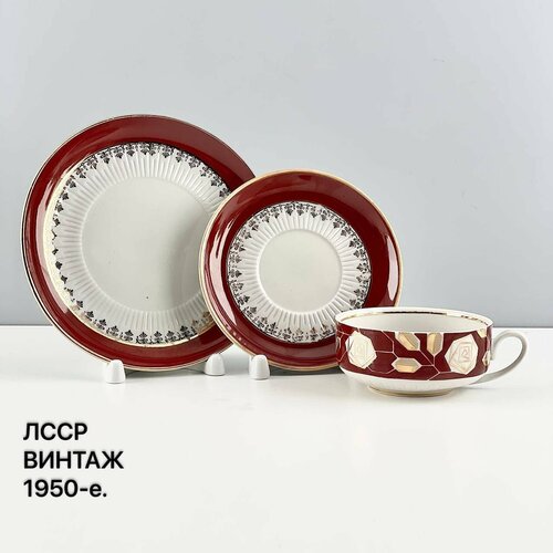 На винтажном товаре могут присутствовать следы бытования, потертости. Пожалуйста, внимательно смотрите фотографии или уточняйте у нашей поддержки интересующие Вас детали. Чашка, объем 150 мл. Блюдце, диаметр 12 см. Пирожковая тарелка, диаметр 15,3 см Перед вами восхитительное винтажное кофейное трио, которое станет настоящим украшением вашей коллекции или прекрасным подарком для ценителей антиквариата и коллекционеров. Кофейное трио выполнено из высококачественного фарфора в стиле ретро и украшено изящным рисунком в виде терракотовых роз. Это уникальное изделие было изготовлено в Латвии в 1950-х годах, когда Рига была одним из крупнейших центров производства фарфоровых изделий в СССР. Это винтажное кофейное трио станет отличным дополнением к вашему интерьеру и добавит ему особый шарм. Оно будет радовать вас своей красотой и функциональностью каждый день. Кроме того, это изделие может стать отличным подарком для ваших близких и друзей. Вы можете подарить его на юбилей, свадьбу или любой другой праздник. Это будет прекрасный способ выразить вашу любовь и уважение к получателю подарка. Винтажное кофейное трио — это не просто набор посуды, это настоящее произведение искусства, которое способно передать атмосферу прошлого и создать уют в вашем доме. Если вы цените качество, стиль и уникальность, то это изделие точно придётся вам по вкусу.