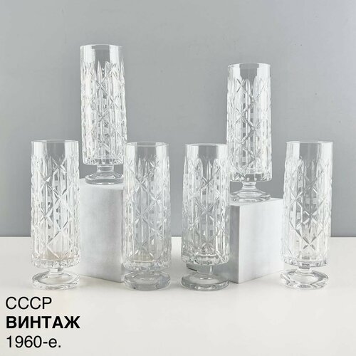 Винтажные бокалы "Шахматные". Набор 6 шт. Хрусталь лзхс. СССР, 1960-е. На винтажном товаре могут присутствовать следы бытования, потёртости, мелкие царапины. Пожалуйста, внимательно смотрите фотографии или уточняйте в вопросах к товару интересующие вас детали. Это товар ответственного потребления. Покупая винтажные вещи вы заботитесь об экологии, уменьшаете углеродный след и сохраняете ресурсы нашей планеты. Присутствуют незначительные следы бытования. Высота-15 см. Диаметр-4,5 см. Объем-180 мл. Винтажные бокалы «Шахматные» — это настоящий шедевр, который перенесёт вас в атмосферу 1960-х годов. Этот набор из шести бокалов выполнен из высококачественного хрусталя лзхс, что гарантирует их прочность и долговечность. Бокалы имеют уникальный дизайн, который делает их неповторимыми и привлекательными. Набор винтажных бокалов «Шахматные» станет прекрасным дополнением к вашей коллекции посуды или стильным аксессуаром для сервировки стола. Они идеально подойдут для сервировки различных напитков, будь то вино, шампанское или ликёр. Эти бокалы были созданы в СССР в 1960-е годы, что придаёт им особую историческую ценность. Они являются не просто посудой, а настоящим произведением искусства, которое может стать украшением любого интерьера. Винтажные бокалы «Шахматные» — это отличный выбор для тех, кто ценит качество, стиль и уникальность. Если вы хотите добавить в свой дом немного атмосферы прошлого века, то этот набор бокалов станет отличным решением. Они подойдут для сервировки стола на праздник, для создания винтажного интерьера или просто для наслаждения красотой и качеством настоящего хрусталя. Не упустите возможность приобрести этот уникальный набор винтажных бокалов «Шахматные» и насладиться их красотой и функциональностью.