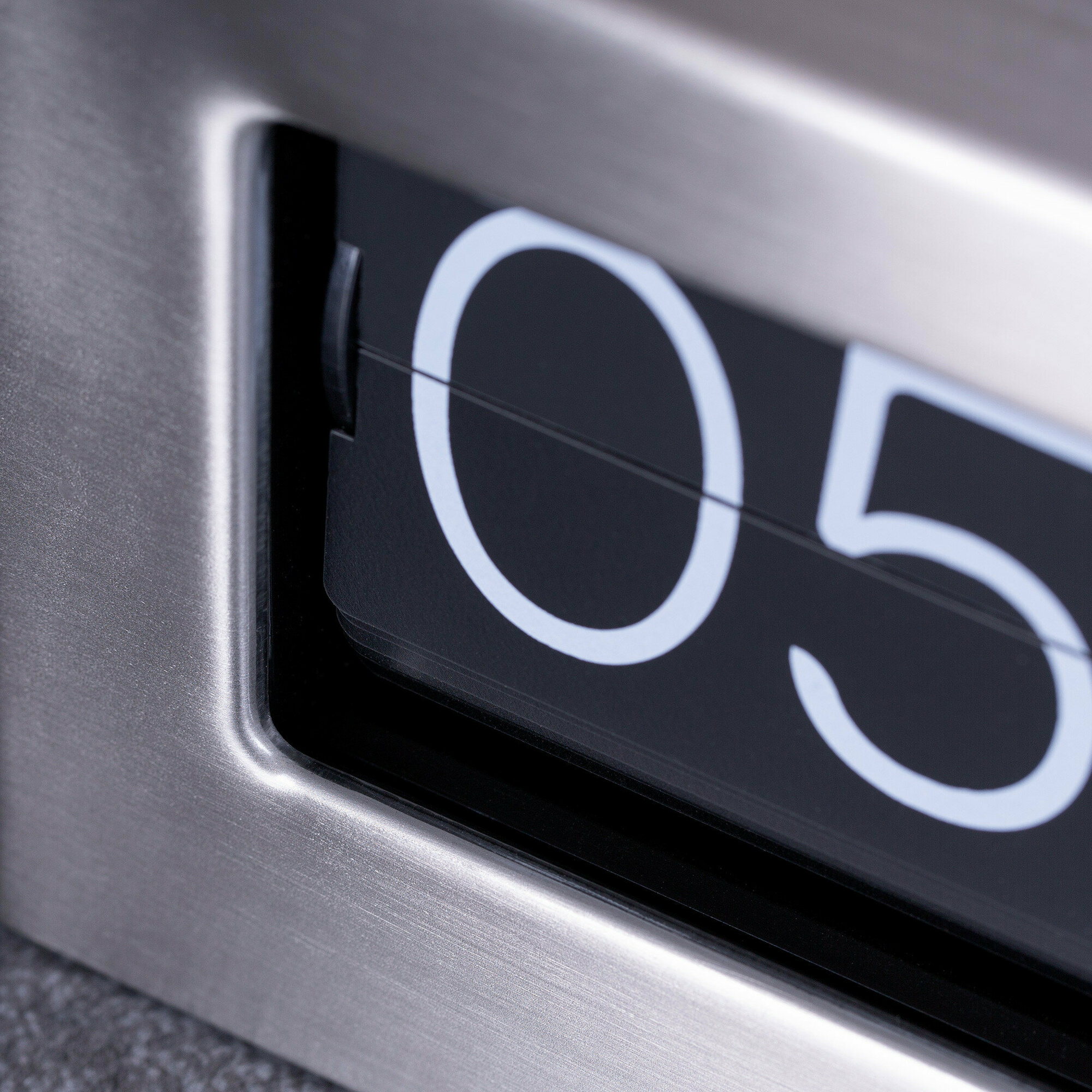 Батарея R14 -2 шт. входят в комплект; Настольная модель с перекидным механизмом; Материал корпуса – металл, материал цифровых пластин - пластик (специальный акрил); Возможность нанести лазерную гравировку; Размер 20х12х7 см