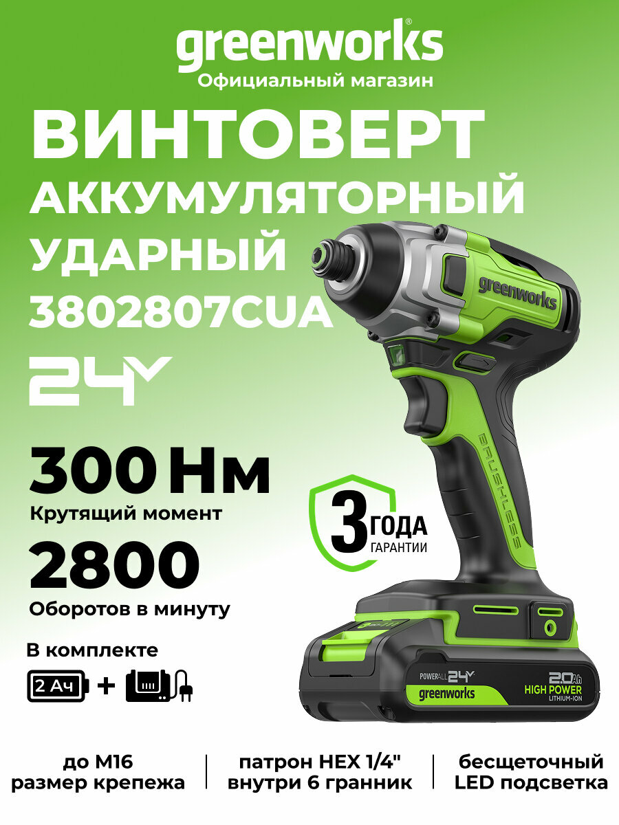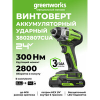 Купить Винтоверт ударный Greenworks GD24ID3, 24V, б/щет,300Нм, 3 режима,1×2Ач, ЗУ, 3802807CUA с доставкой по всей России.