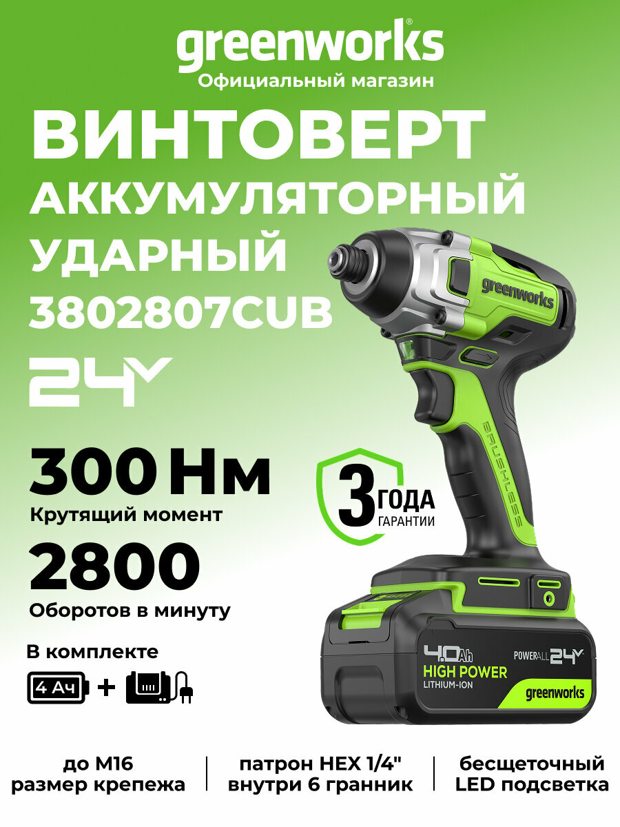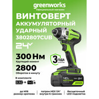 Купить Винтоверт ударный Greenworks GD24ID3, 24V, б/щет, 300Нм, 3 режима,1×4Ач, ЗУ, 3802807CUB с доставкой по всей России.