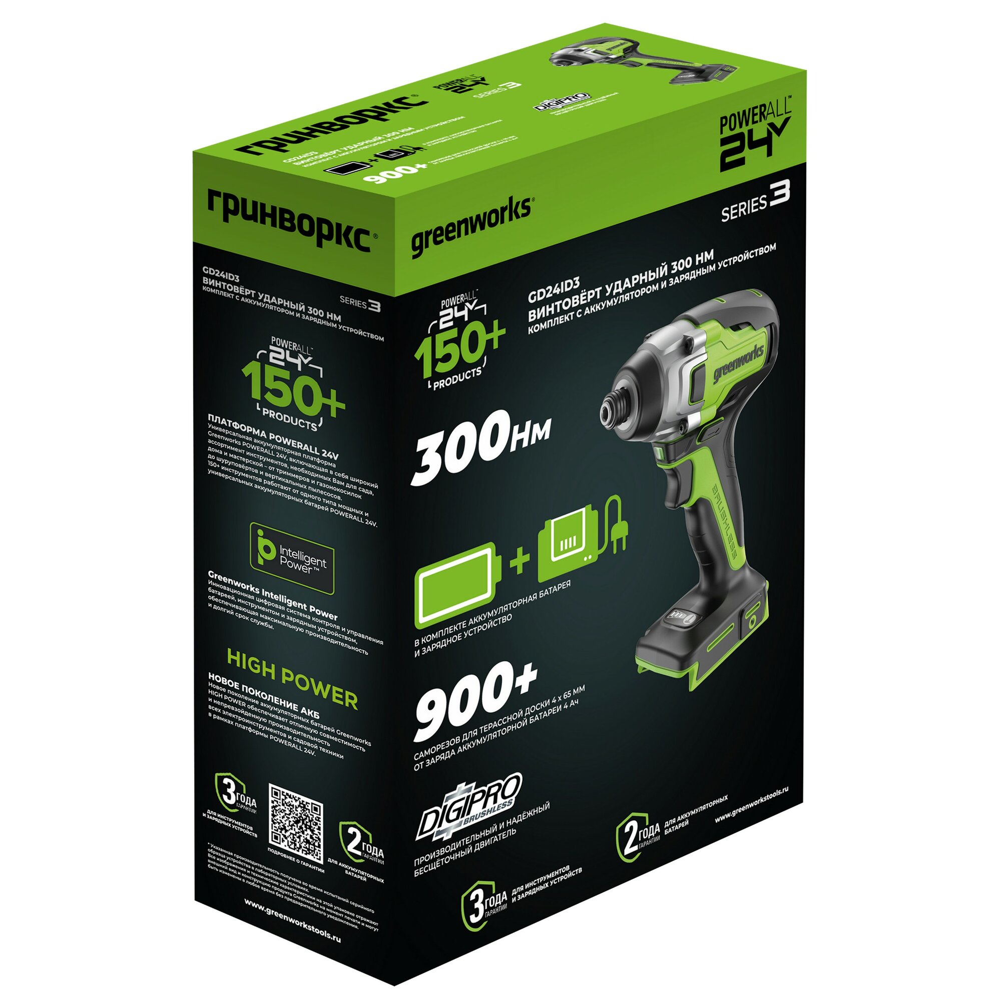 Винтоверт ударный Greenworks GD24ID3, 24V, б/щет, 300Нм, 3 режима,1×4Ач, ЗУ, 3802807CUB: сравнение цен, характеристики, фото, актуальное наличие и цены.