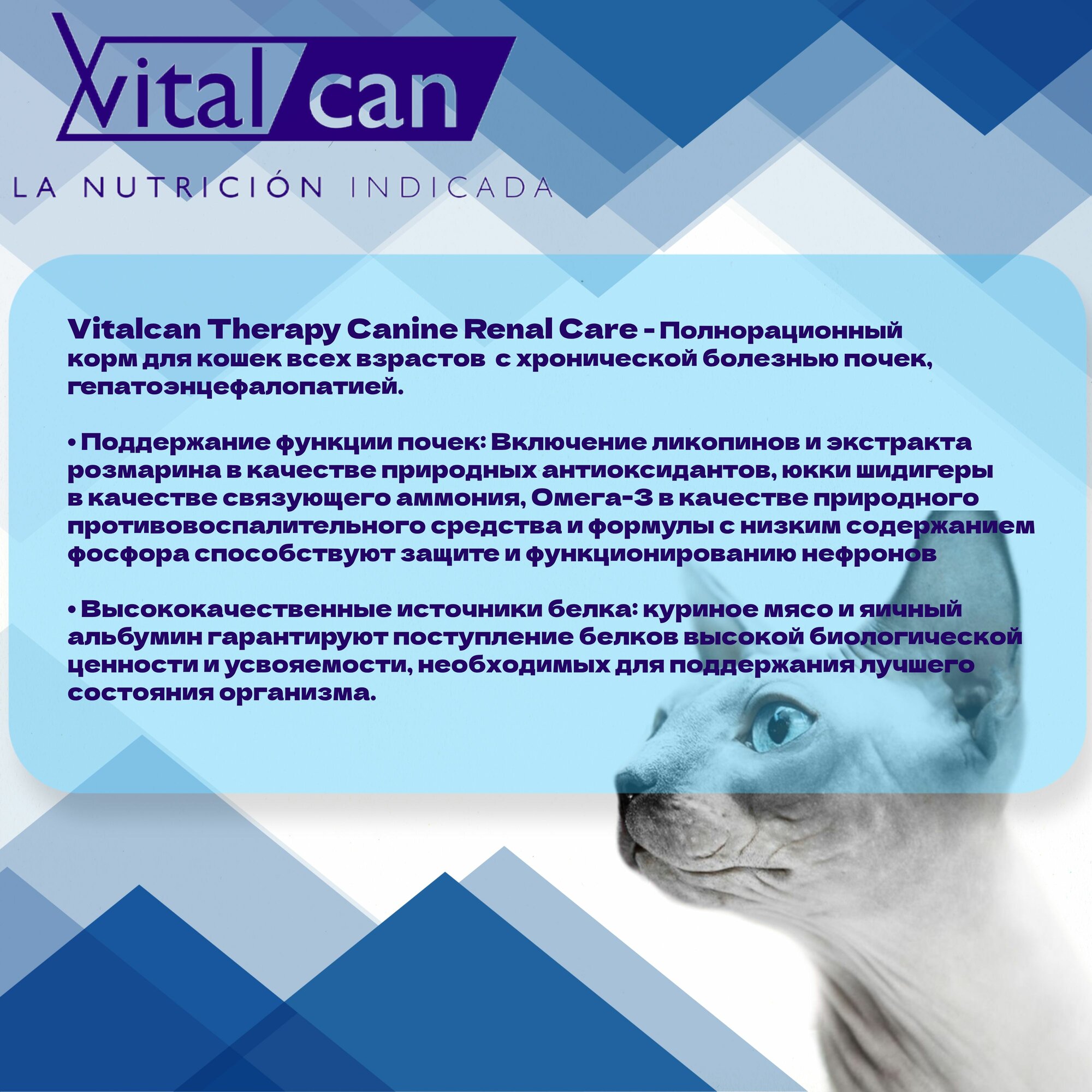 Vitalcan Therapy Feline Renal Care - лечебный полнорационный корм для взрослых кошек, страдающих хронической болезнью почек (ХБП), заболеваниями, требующими низкого потребления натрия и печеночной энцефалопатией.