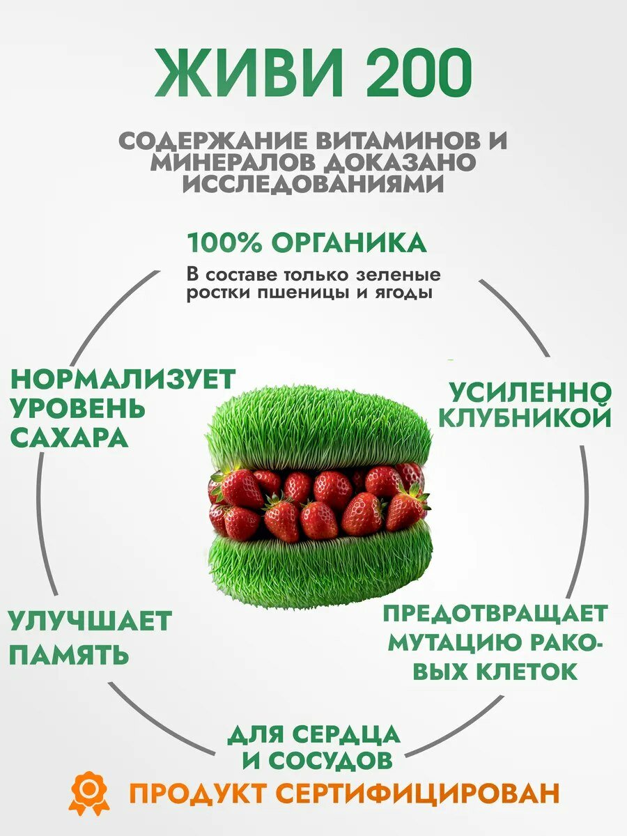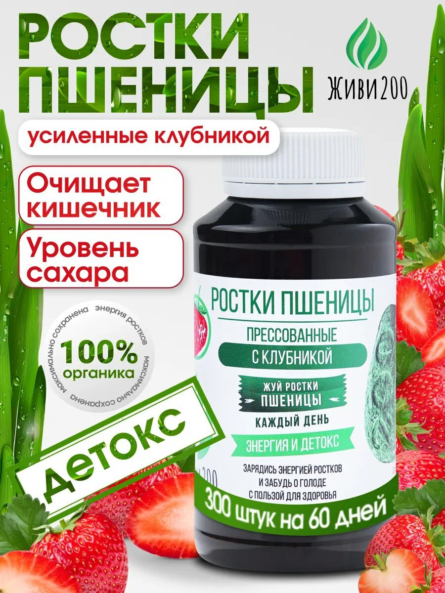 Ростки пшеницы (Витграсс) — суперфуд и натуральная пищевая добавка без глютена, оказывающая комплексное действие на организм. Детокс эффект обусловлен способностью таблеток увеличиваться в объеме непосредственно в кишечнике, тем самым утолить голод, абсорбировать токсины и выводить многолетние накопления шлаков. Ростки пшеницы прессованные — уникальный по содержанию полезных веществ продукт, в котором витамины и клетчатка содержатся в очень высокой концентрации. В сочетании с клубникой ростки пшеницы живи200 работают для очищения кишечника и способны укреплять иммунитет, стабилизировать состав крови, стимулировать рост волос и ногтей, оказывать тонизирующее действие на стенки сосудов, а также улучшать психоэмоциональное состояние путем повышения уровня дофамина. В составе комплекса витамины группы В, С, РР, А, Е, К, микроэлементы (йод, магний, цинк, натрий, железо, кальций, медь), хлорофилл, антиоксиданты.