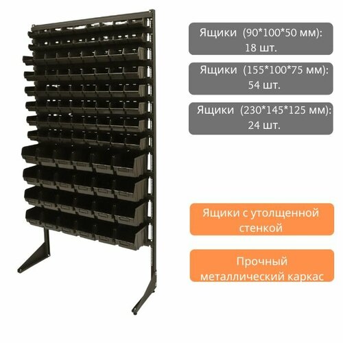 Наполнение стеллажа: Ящики (90*100*50 мм): 18 шт. Ящики (155*100*75 мм): 54 шт. Ящики (230*145*125 мм): 24 шт. Всего ящиков: 96 шт. Металлический стеллаж с пластиковыми ящиками предназначен для хранения крепежа и мелких товаров. Стойка окрашена порошковой краской. Ящики изготовлены из полипропилена высокого качества. Надежность конструкции гарантируется. Стеллажи с ящиками идеально подойдут для магазина крепежа, склада или станут хорошим решением при размещении запчастей в гараже. Грузоподъемность – 800 кг. Стеллаж показывает высокое качество эксплуатации, даже при полной загрузке ящиков.