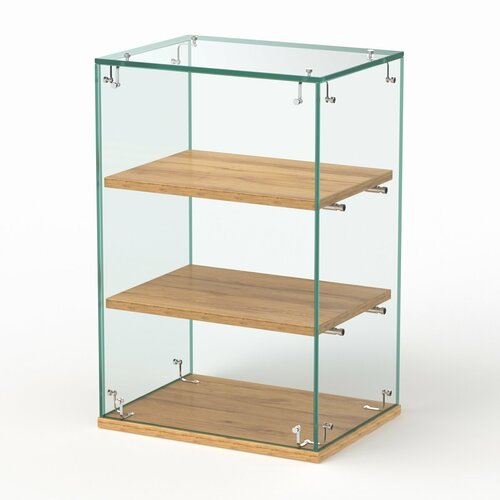 Витрина полностью стеклянная. Внутри располагаются две прямые полки. Доступ к содержимому обеспечивается со стороны продавца.