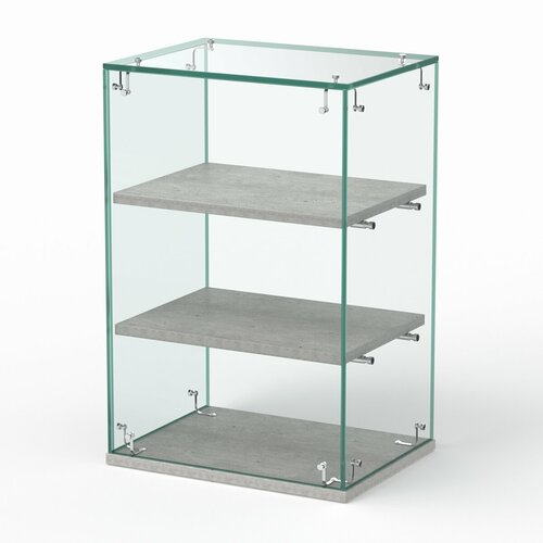 Витрина полностью стеклянная. Внутри располагаются две прямые полки. Доступ к содержимому обеспечивается со стороны продавца.