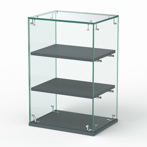 Витрина полностью стеклянная. Внутри располагаются две прямые полки. Доступ к содержимому обеспечивается со стороны продавца.