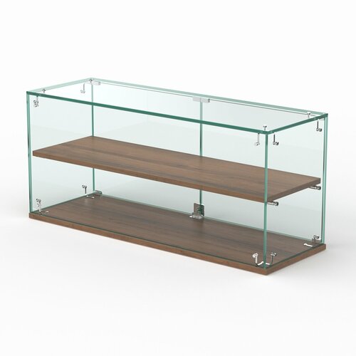 Витрина полностью стеклянная. Внутри располагается одна полка. Доступ к содержимому обеспечивают распашные дверки, расположенные со стороны продавца.