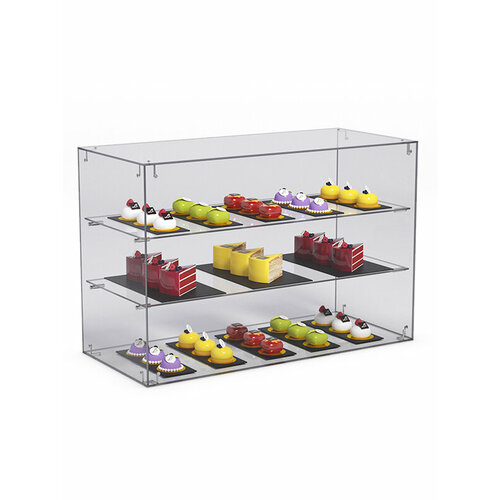 Витрина выполнена из стекла, что обеспечивает прозрачность и позволяет демонстрировать товар в наилучшем свете. Внутри расположены две прямые полки, обеспечивающие удобное размещение и доступ к содержимому со стороны продавца.