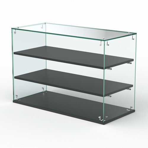Витрина полностью стеклянная. Внутри располагаются две прямые полки. Доступ к содержимому обеспечивается со стороны продавца.