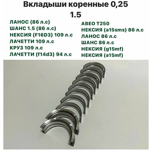 Вкладыши коренные 0,25 Шевролет Ланос (86 л. с.), ЗАЗ Шанс 1.5 (86 л. с.), Нексия (F16D3) 109 л. с, Шевролет Лачетти 109 л. с, Шевролет Круз 109 л. с, Шевролет Лачетти (F14D3) 94 л. с, Авео Т250, Нексия (A15SMS) 86 л. с, Нексия (G15MF), (A15MF): сравнение цен, характеристики, фото, актуальное наличие и цены.