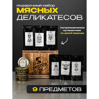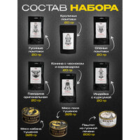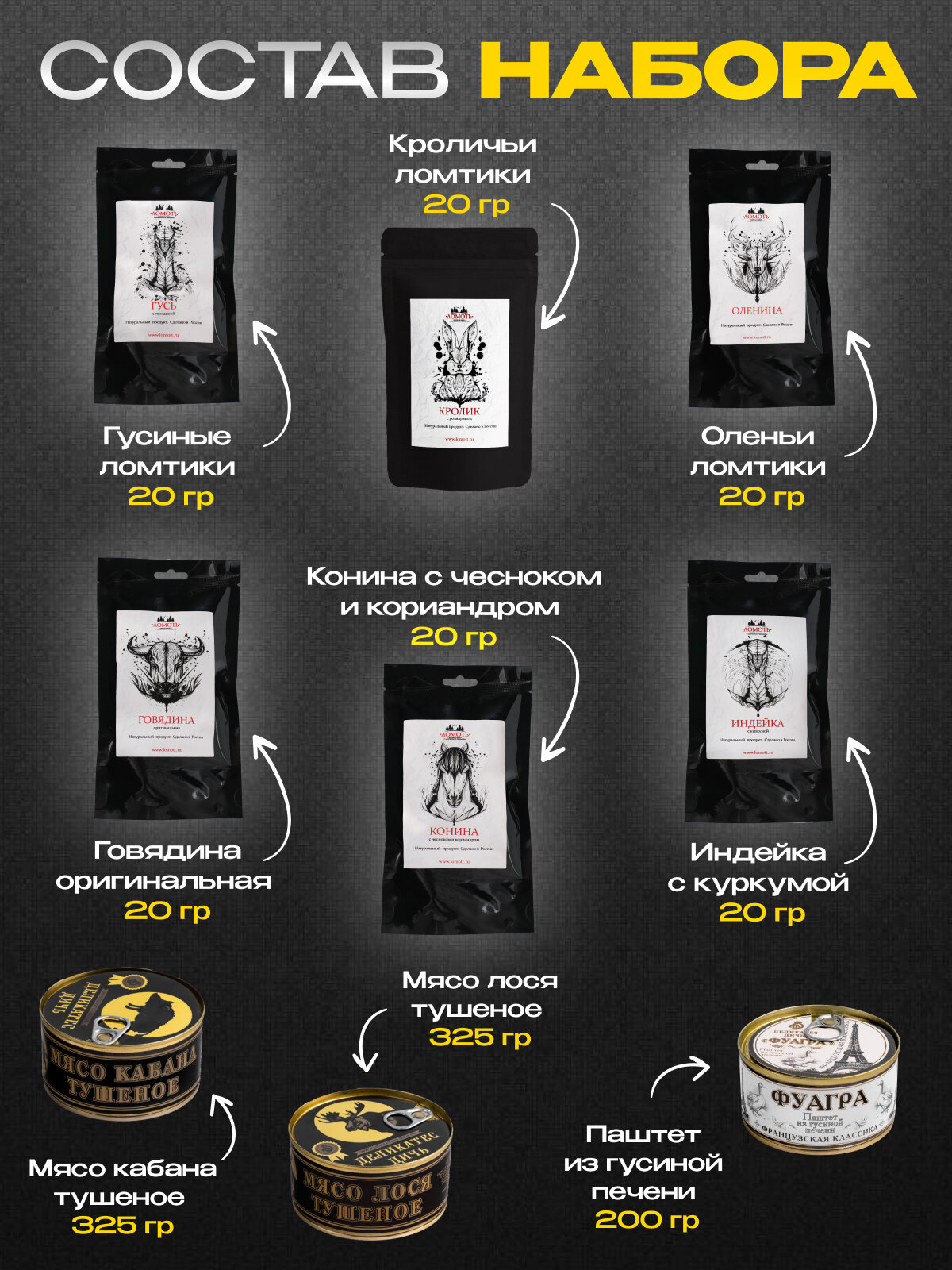 | В наборе | Индейка с куркумой 20 гр. Говядина оригинальная 20 гр. Оленьи ломтики, 20 гр. Страусиные ломтики, 20 гр. Гусиные ломтики, 20 гр. Конина с чесноком и кориандром 20гр Паштет из Гусиной печени Фуагра 200г Мясо кабана тушеное 325г Мясо лося тушеное 325г Подарочная картонная коробка MISTER BOX |