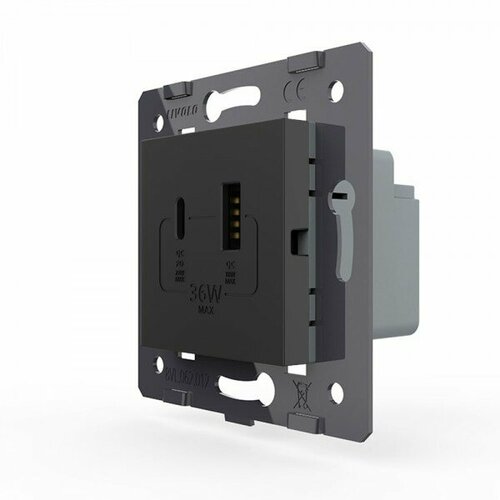 Механизм двойной USB розетки Livolo с разъёмами USB-C и USB-A. Устанавливается в стандартный круглый подрозетник. USB выходы c максимальной мощностью до 18Вт каждый. Подходит для быстрой зарядки любых устройств. Поддерживаются протоколы подзарядки PD3.0, QC3.0 5-12V, HUAWEI FCP 5-9V, AFC 5-12V, APPLE 5V / 2.4A, BC1.2 DCP и другие. Розетка защищена от перегрузок, от перегрева, от короткого замыкания, от электрического перенапряжения. Можно устанавливать группами от 2 до 5 розеток или совместно с сенсорными выключателями Livolo под одной стеклянной рамкой.