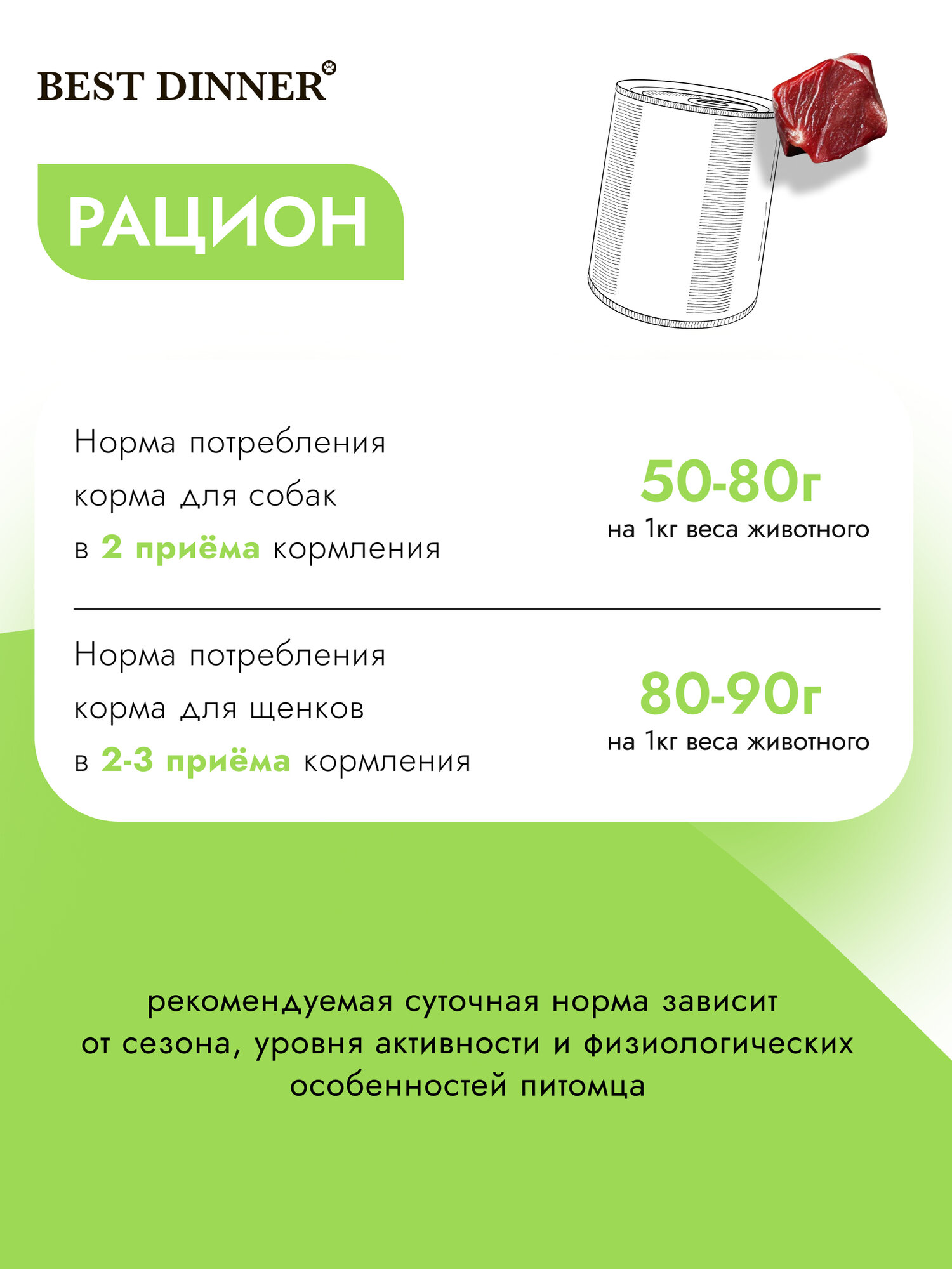 | Дозировка | Рекомендуется давать собакам 45-80 г., щенкам - 70-90 г на кг веса в 2-3 приема кормления. Употреблять при комнатной температуре. |