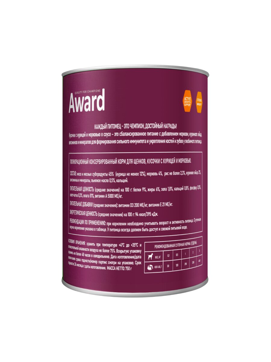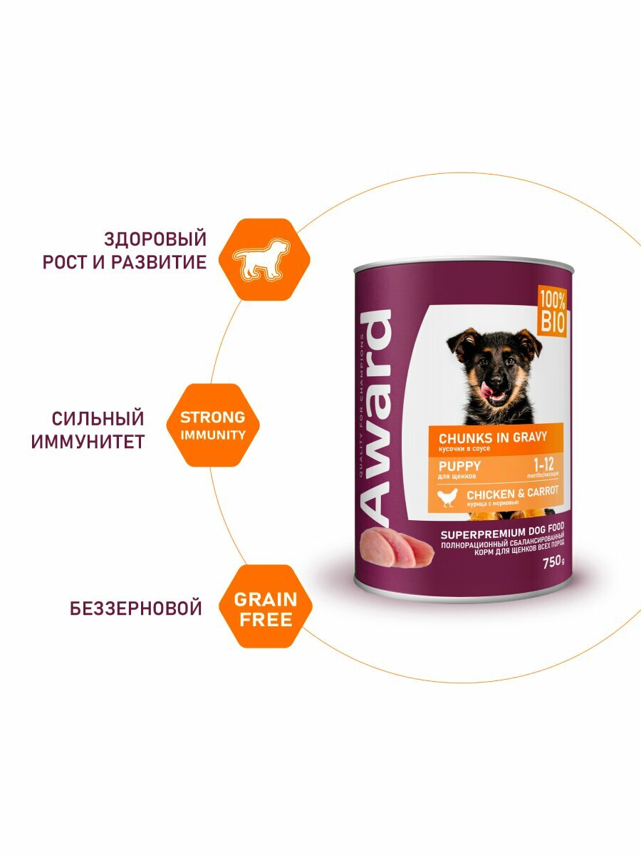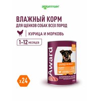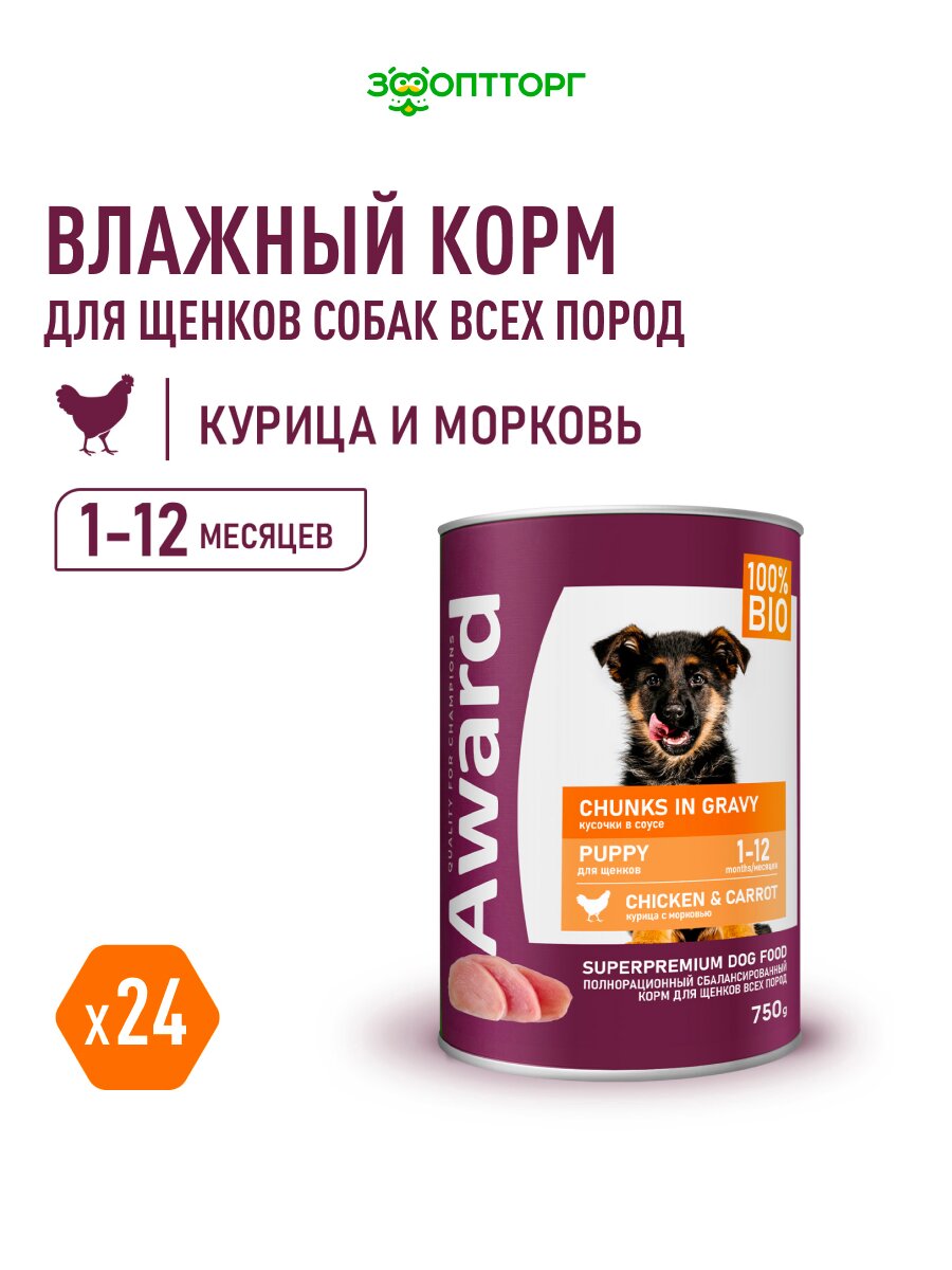 Влажный корм Award консервы для щенков (кусочки в соусе) Курица и морковь, 750 г х 24 шт.: сравнение цен, характеристики, фото, актуальное наличие и цены.